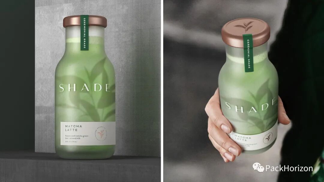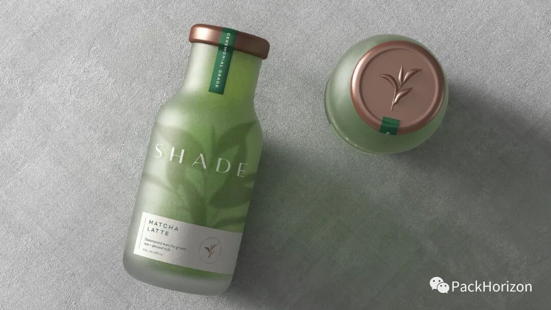 Shade抹茶拿铁瓶使用磨砂玻璃进一步讲述阴影故事,并庆祝内部产品的鲜艳色调。