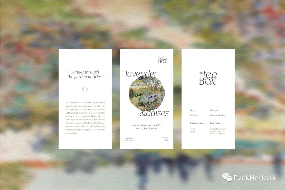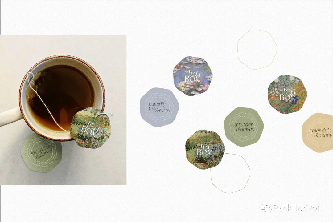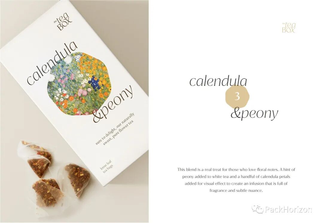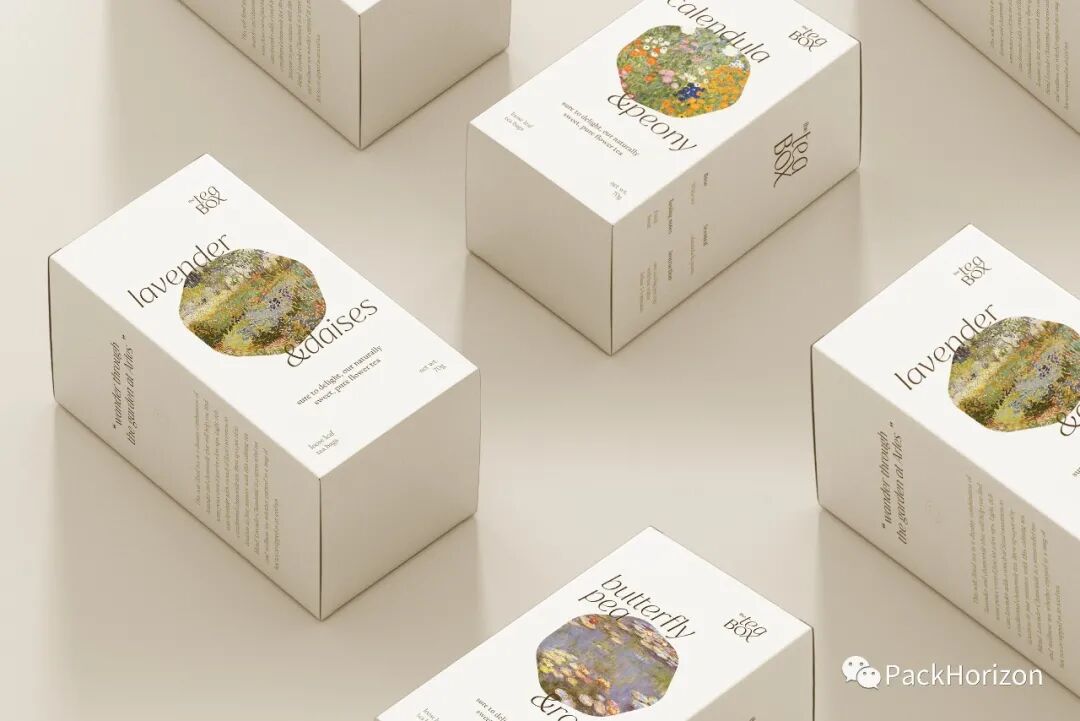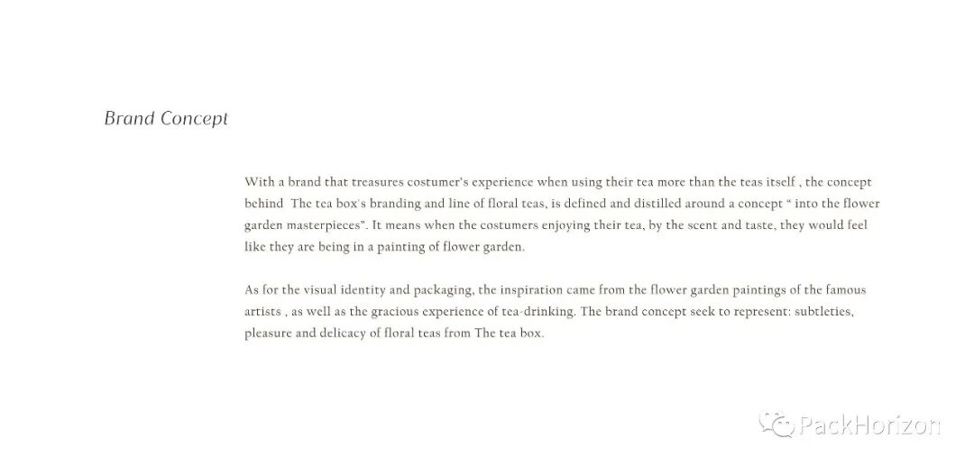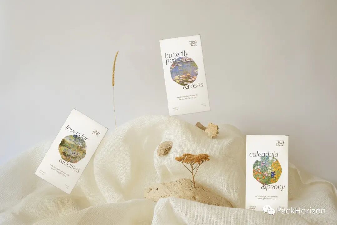 至于视觉识别和包装,其灵感来自于著名艺术家的花圃画作,以及喝茶的亲切体验。品牌概念试图表现:茶盒中的花茶的微妙、愉悦和精致。