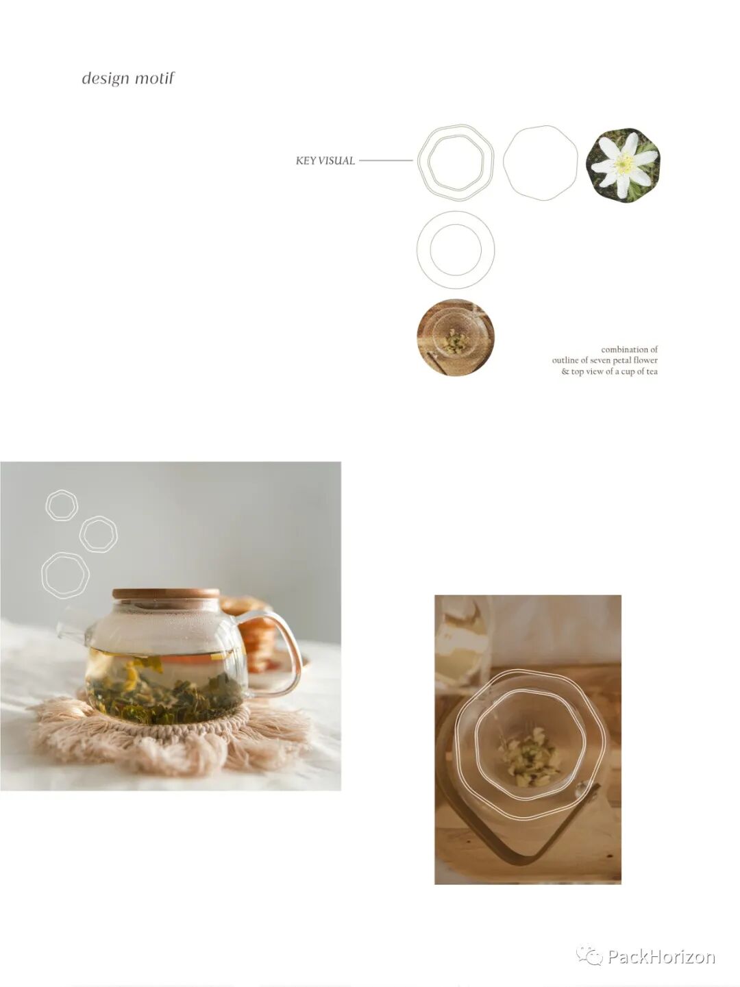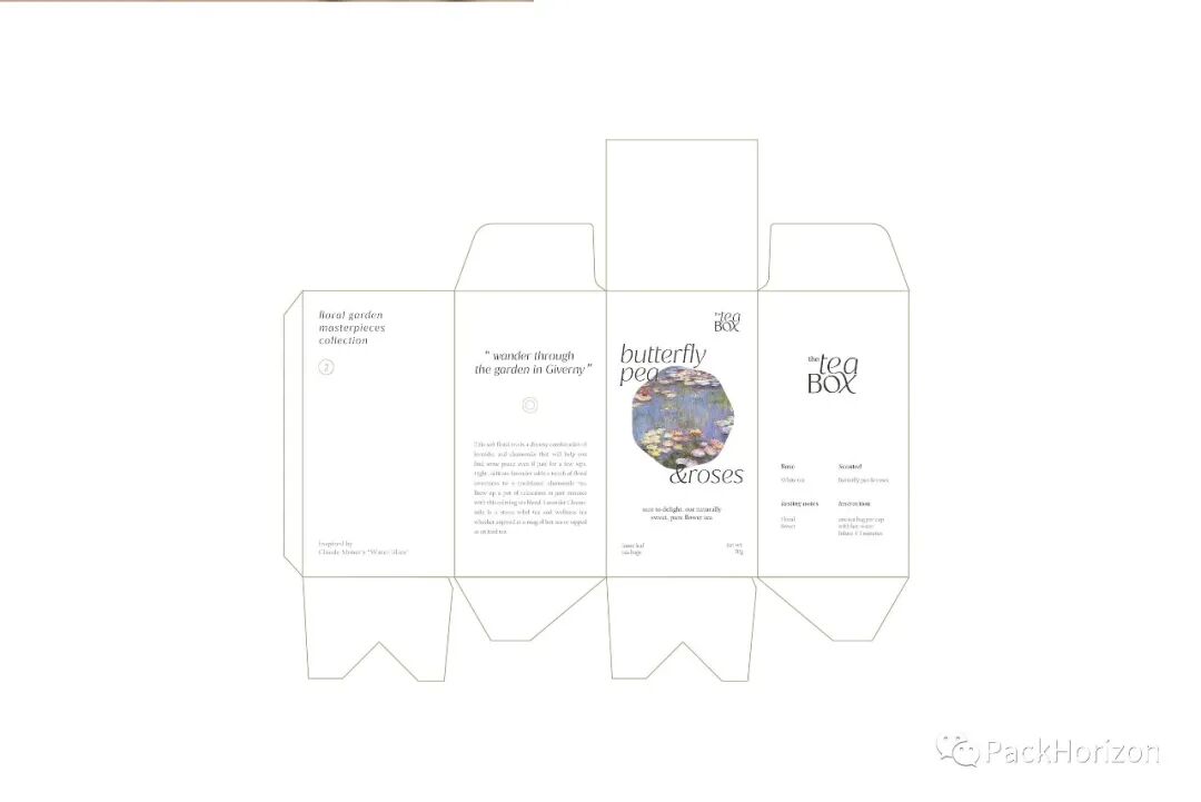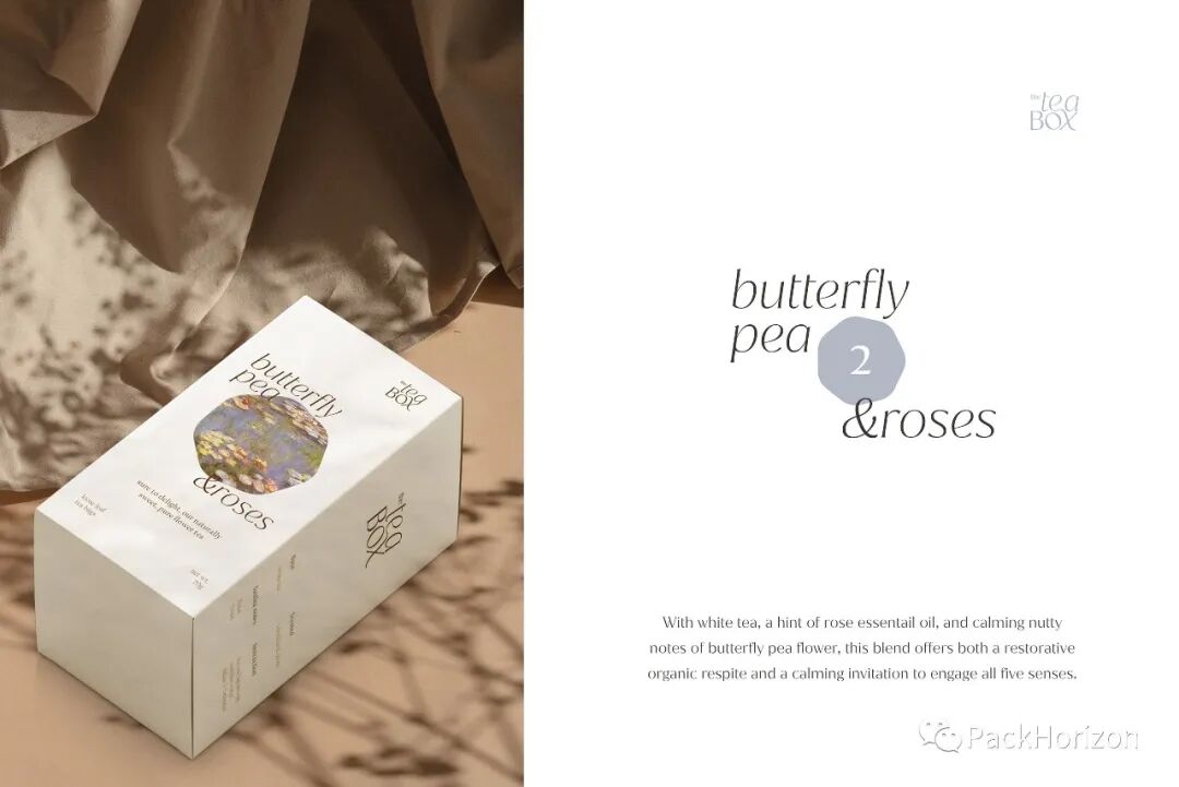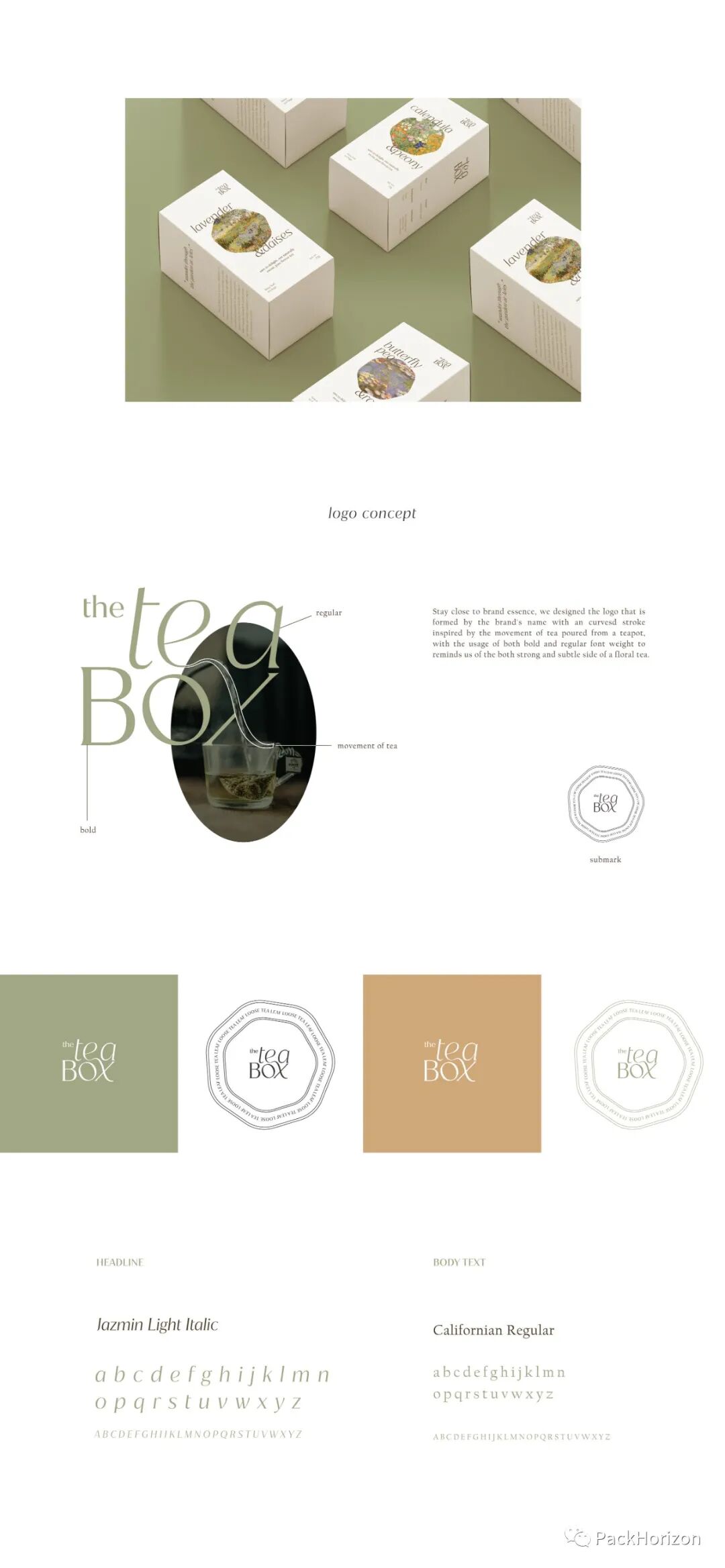 至于视觉识别和包装,其灵感来自于著名艺术家的花圃画作,以及喝茶的亲切体验。品牌概念试图表现:茶盒中的花茶的微妙、愉悦和精致。