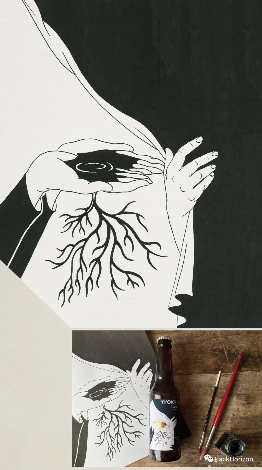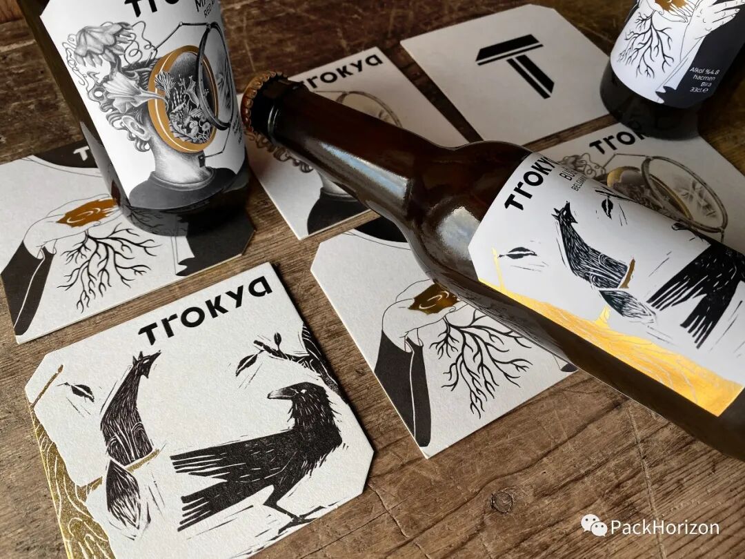 Trokya的标签设计通过不同类型的模拟插图技术强调了品牌的工艺特点;一幅插图是用铅笔创作的,一幅是用画笔和墨水创作的,另一幅是用油印的。我们通过定制与标签形状平行的字母来保持标志的最小化,并专注于用视觉故事描述不同体验的插图。每幅插图通过这些啤酒的味道展示了不同的维度和感知的变化,让消费者同时有了创造性的解释。