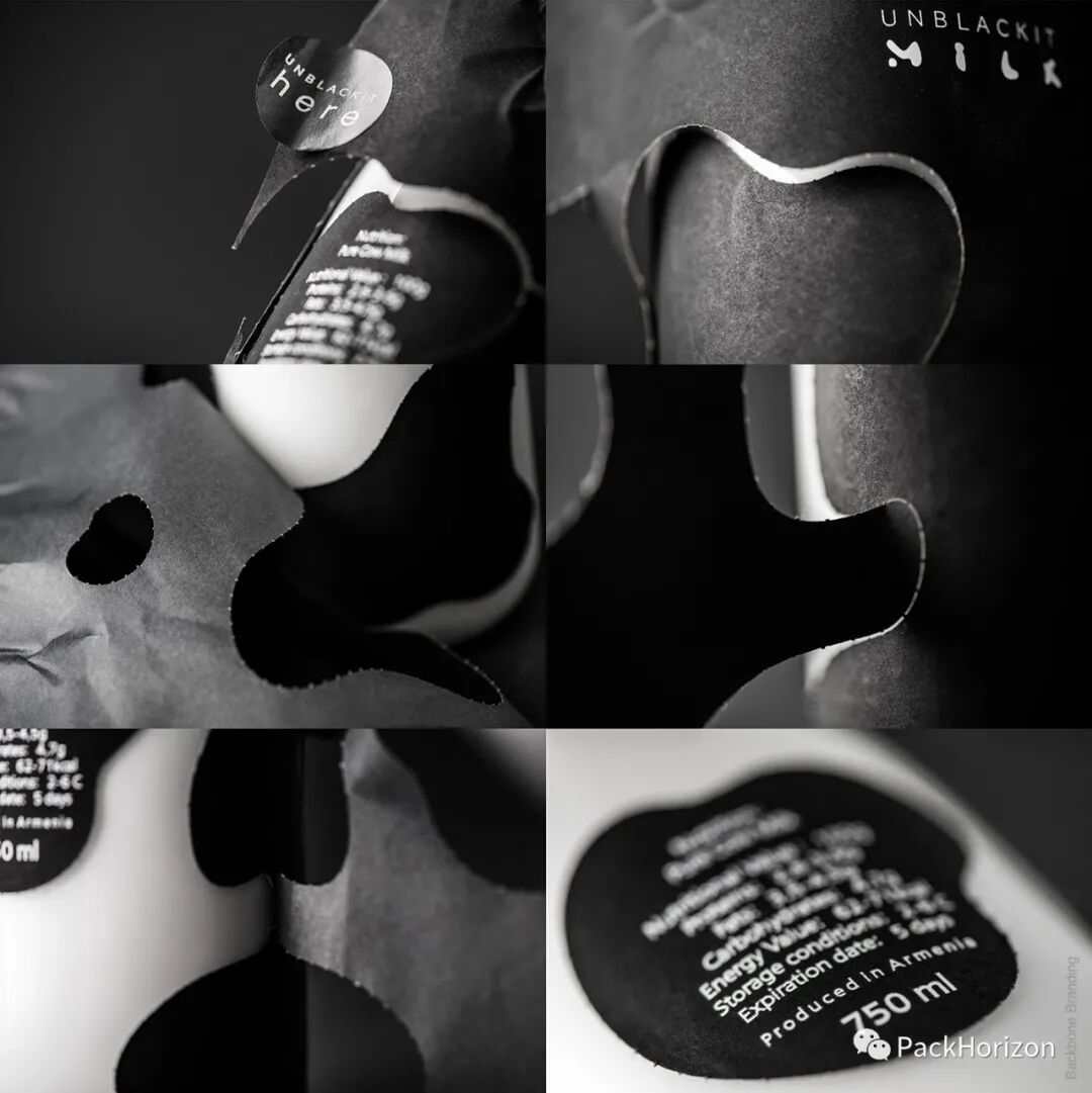 “Unblackit”是一种牛奶产品,装在用黑色纸包裹的透明玻璃瓶中。黑色包装的瓶子站在其他乳制品旁边的架子上,引起了人们的兴趣,促使顾客在通常的全白牛奶架子上找出黑色瓶子的奥秘。当您将产品带回家并开始打开瓶子时,这种好奇心继续存在。沿着玻璃出现的风格化的黑色斑点是为了描绘挤奶牛身上的相同斑点。它的技术是带有粘性点的穿孔纸。解开包装或 "解黑 "的过程是包装设计的最后一步,也成为产品的命名理念。标志的排版也是为了适应同样的奶牛图案风格。玻璃瓶被选为装牛奶的最佳合适选择。这是由于它在保持产品新鲜方面的卓越能力,以及透明和水晶般洁净的美学魅力之上。