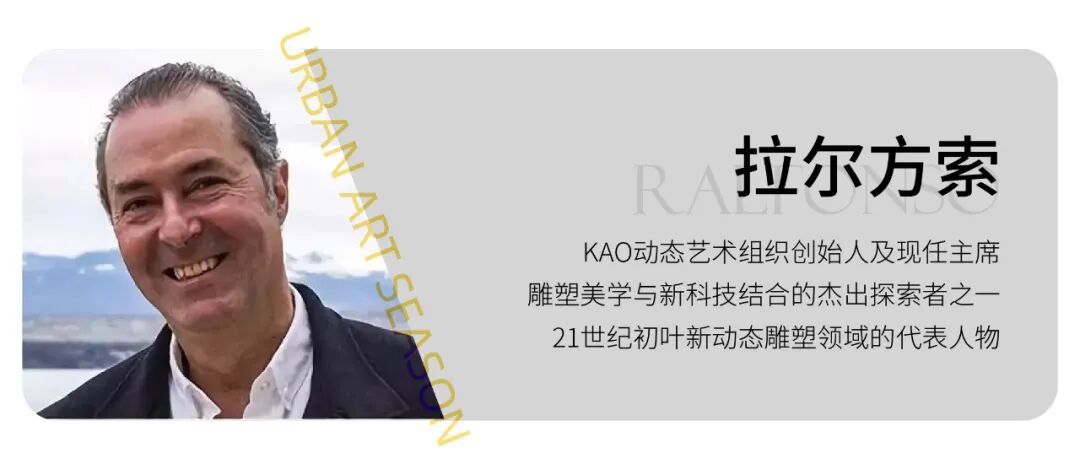 拉尔方索(Ralfonso)便是动态雕塑领域的杰出代表。他是全球最大的动态艺术组织(KAO)创始人及现任主席,是雕塑美学与新科技结合的杰出探索者之一,被誉为21世纪初叶新动态雕塑领域的代表人物。