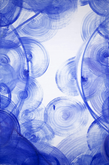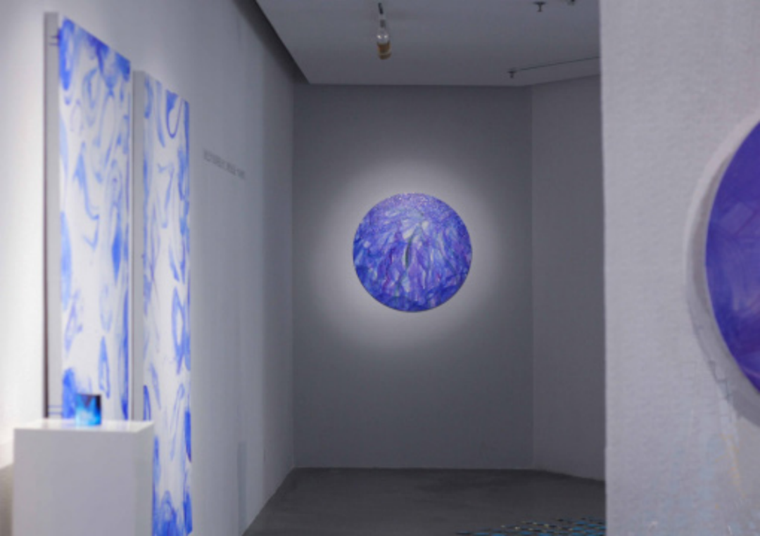 而蓝色是让人愉悦和充实的颜色。王嘉成徜徉在一片蓝色大海里,用挥洒自如的画笔勾勒出未知生命在其生存空间中一呼一吸的状态,从有形到无形,从物质到物性,以虚构空间的第三视角,述说着属于她自己对于水的理解和美学语言。