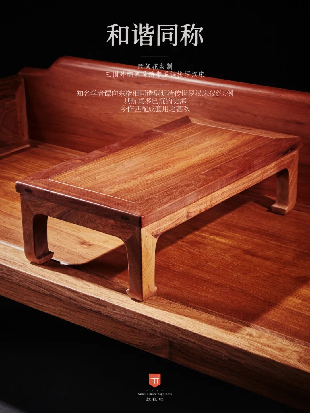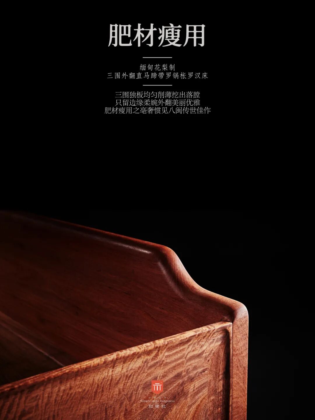 此罗汉床围板便以三块大果紫檀整木制作,两端拍抹头。正面围板略高于侧面围板,高出的部分经由两侧平缓自然的委角曲线过渡,有效削弱了直接落差的唐突。