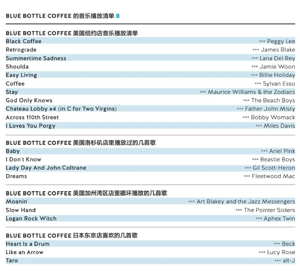 根据《蓝瓶物语》的品牌宣传手册,blue bottle的咖啡师可以按客人要求换一张专辑,或自由选择背景音乐;