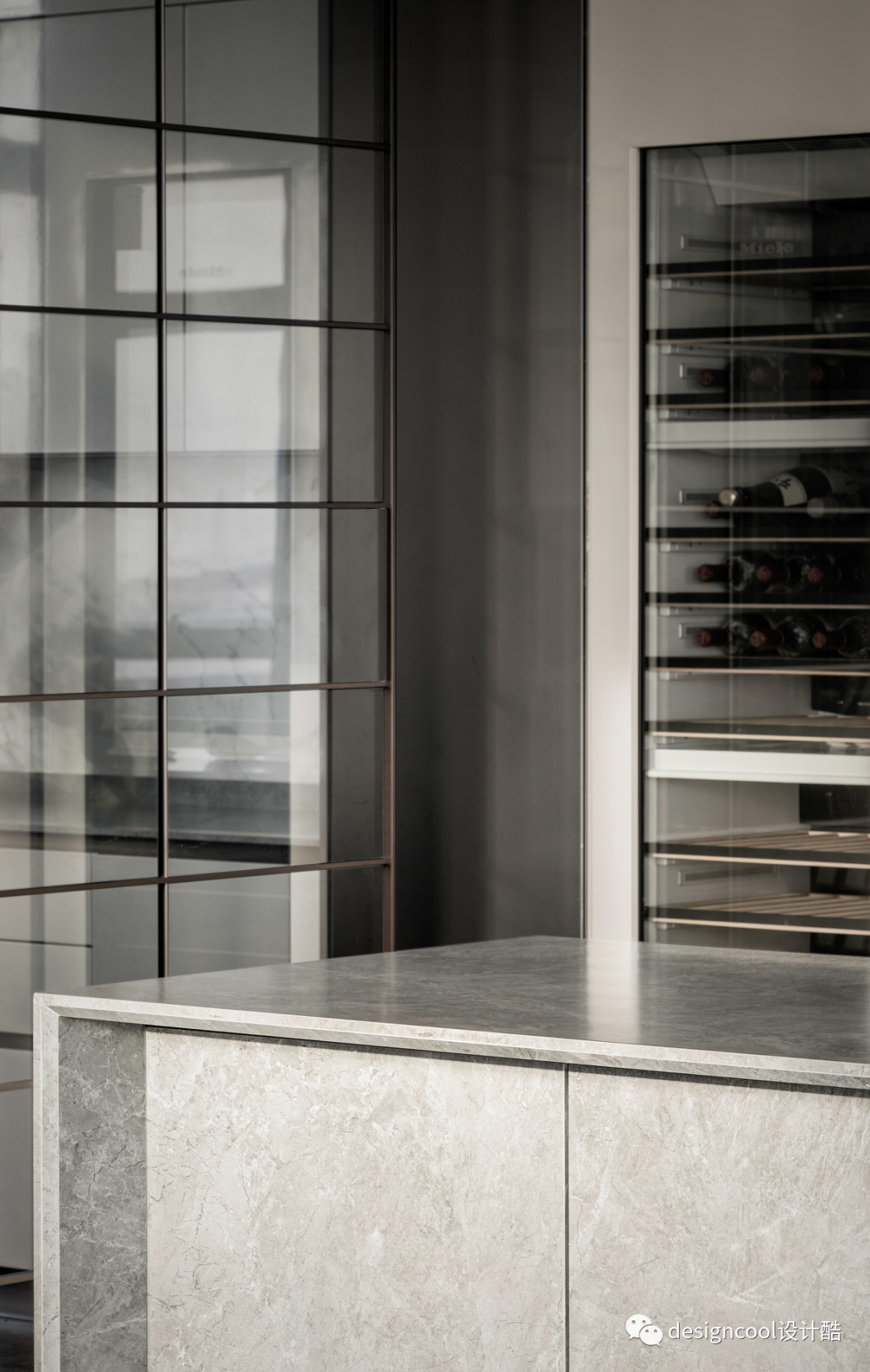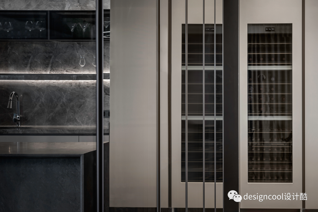 内建筑式⼿法打造的观景休息厅, ⾼级灰调⻢鞍⽪柜体, 朦胧玻璃材质电动⻔, 以及闪耀⾦属光泽的酒架......成为随处可⻅、精⼼设置的巧思与细节。