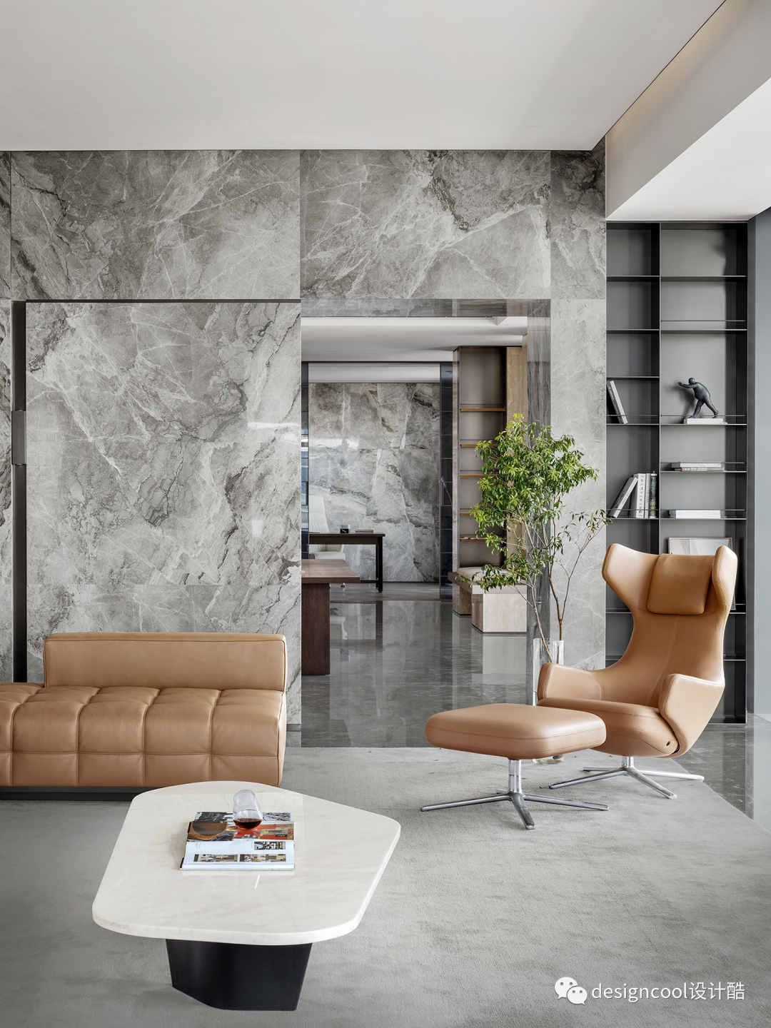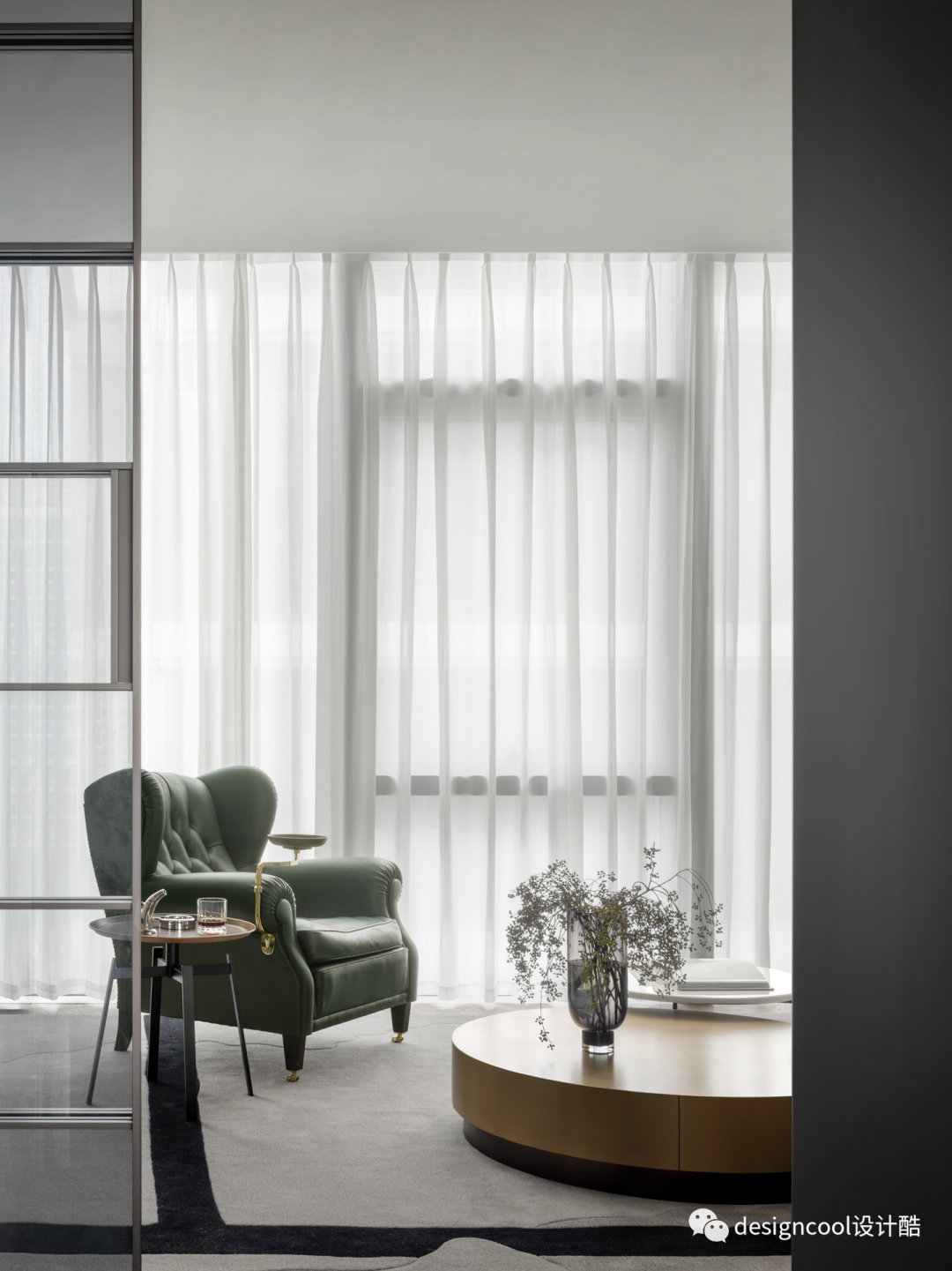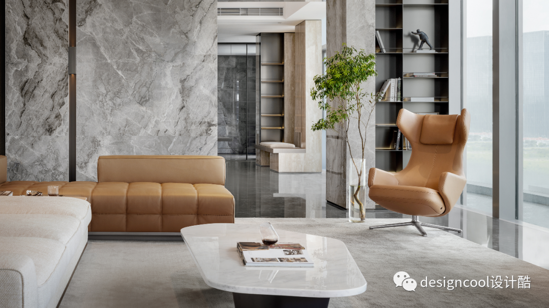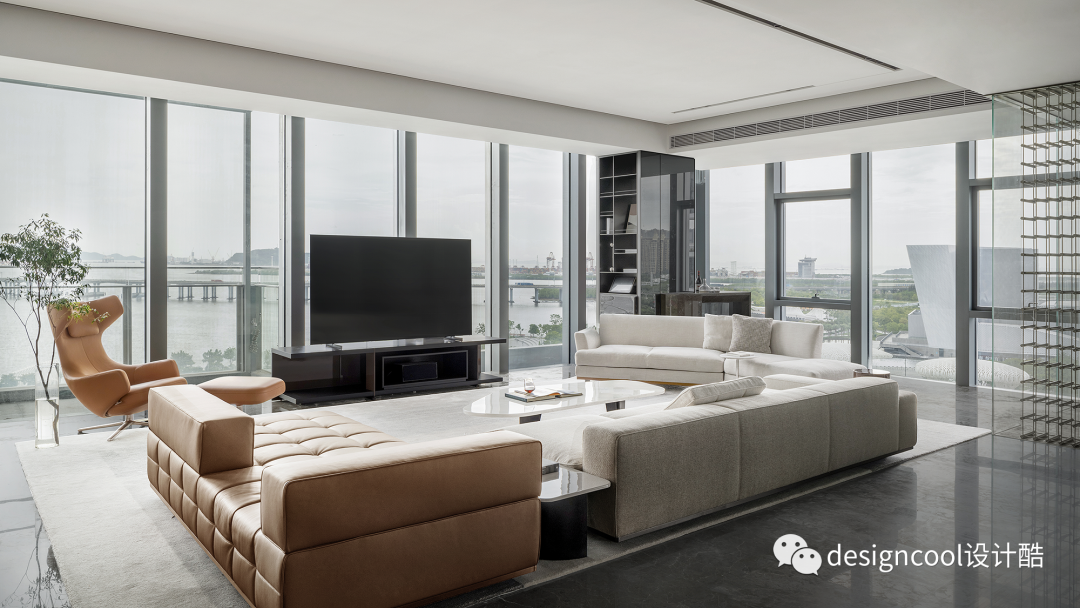 有别于窗外景⾊的丰富饱满, 会客厅⽤不同程度⾊调的⽩、棕、灰表达着愈发沉静的内敛。精神层次上的精简剔除了忙碌⼯作中的繁冗拥堵,刻画出朋友们欢聚最松弛的⼀⾯。环绕设置的多⼈沙发、单⼈座椅, ⽤现代简约的⼿法, 点滴回应着不同习惯的⽣活⽅式。