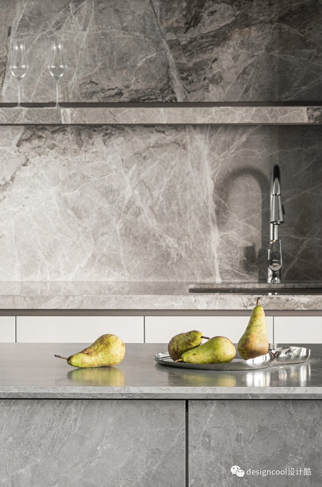 明与暗的对⽐并⾮极致的冲突, 细节处⼜配合着天然⽯材纹理的⾊彩过度, 模糊这过分清晰的明暗界定。