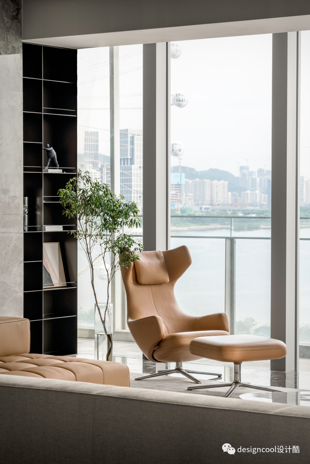 整个聚享空间变的通透⽆阻, 与窗外景观⾃然融为⼀体, 置⾝都市丛林中也能享受到的⾃然氛围感油然⽽成。
