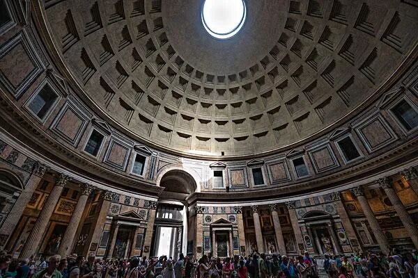 这座被高傲的米开朗基罗称为“天使的设计”的建筑,其穹顶的厚度从地面处的6米逐渐过渡到顶端的1.5米,建筑材料主要由灰浆和火山灰混合而成,且在穹顶的不同部位混合的比例略有不同。逐渐递减的穹顶厚度减轻了穹顶的重量,因此穹顶下即使没有任何支撑也可以让万神殿历经千年而不倒。此外穹顶的内壁立面被划分为5排,每排28个向内凹陷的方格让墙壁厚度的递减更加自然,也让穹顶内部形成了一个天然的聚声器。