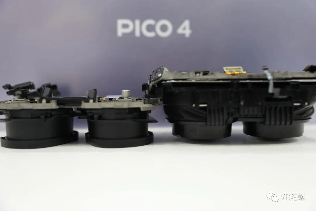 VR陀螺拆解测量得知,PICO 4 的光机模组高约 30mm,单个重量约 37g(含屏幕),相对于上一代采用菲涅尔透镜方案的 PICO Neo3,PICO 4 的 TTL 缩小了 15mm 左右。