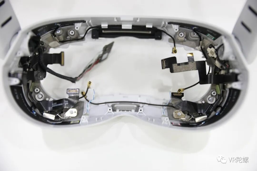 不管是头显正面主板部分,还是背面透镜部分,零部件都十分紧凑,在 PICO 4 壳身内部四周的各类传感器和线材更是十分密集,不放过一丝可利用空间。