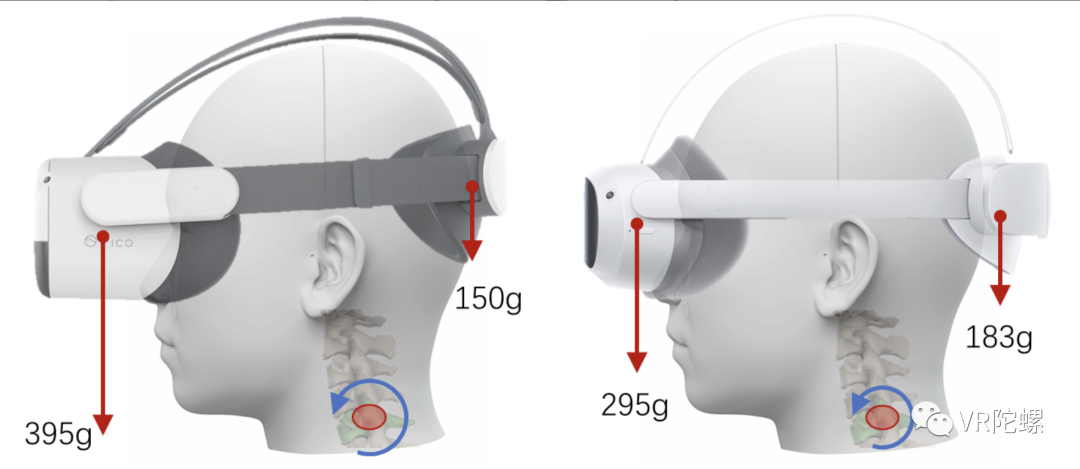 前端主机的重量的降低也进一步提高了 VR 一体机前后配重的均衡性,PICO Neo3 的前后配重比为:395/160=2.24,PICO 4 的前后配重比为 295/187=1.57。