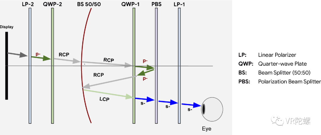 使用偏振折叠机制,可以在紧凑的器件内,实现光源的传输和虚像放大。具体来看,在经典的 Pancake 光学设计中,来自显示器的光首先通过一个圆形偏振器(假设为RCP)和一个半反半透镜,然后通过一个1/4相位片(QWP)传输,该 QWP 将光的偏振改变为 P 偏振。