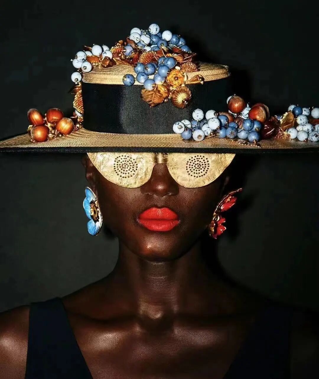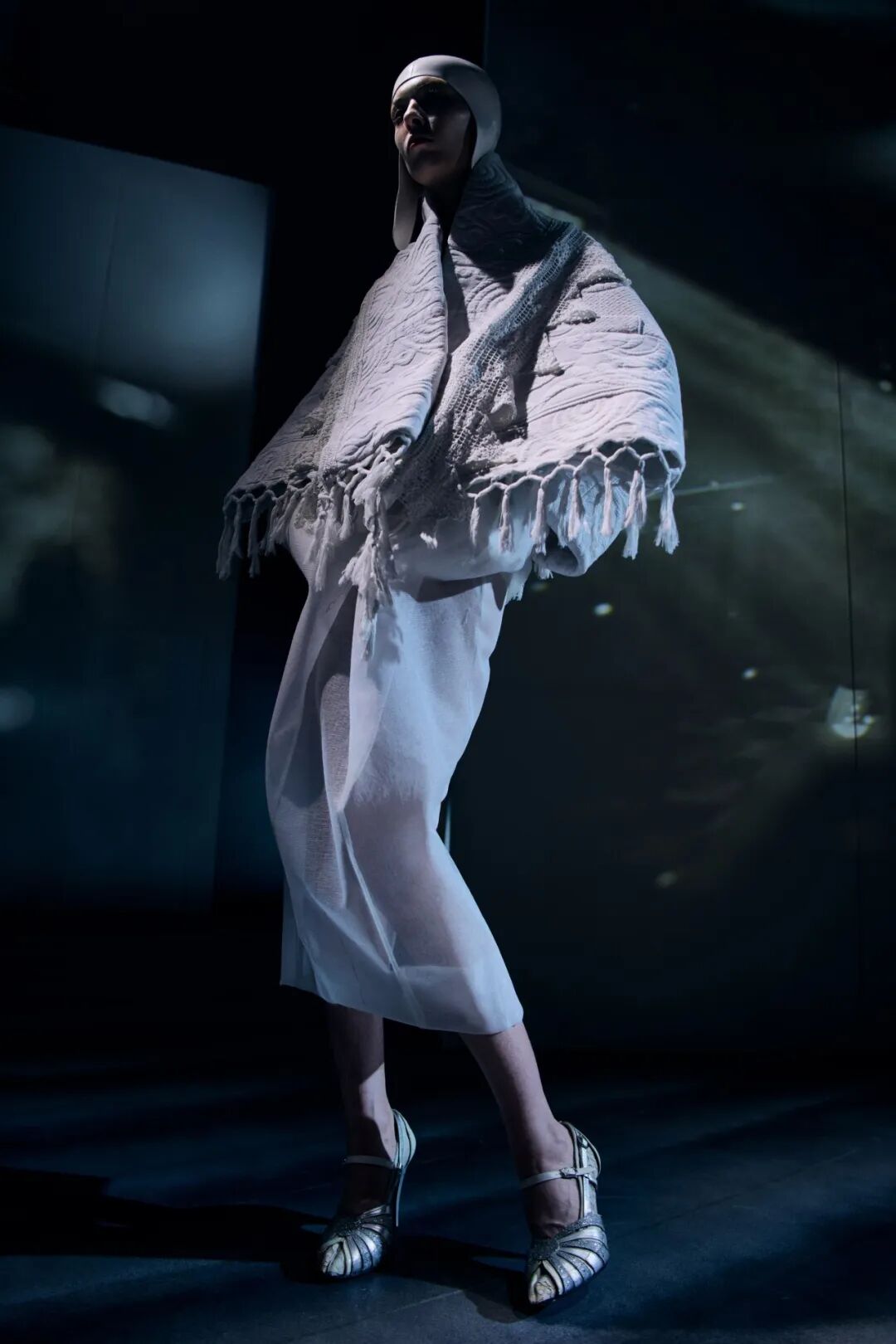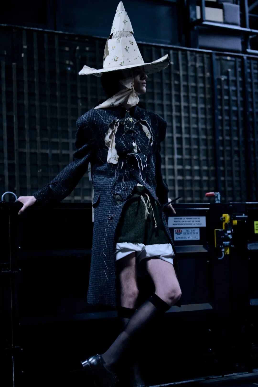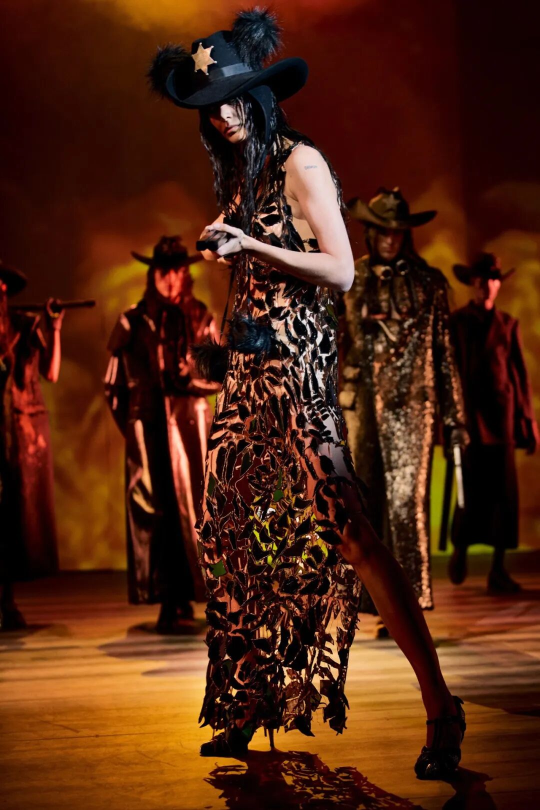 Maison Margiela2022秋冬,John Galliano从舞台剧“德古拉”汲取灵感,讲诉一对恋人逃离家庭和命运的束缚,往事不断闪现,他戏服化的设计华丽浪漫,鬼魅神秘,热烈奔放,让人印象深刻的是各种帽子配饰。