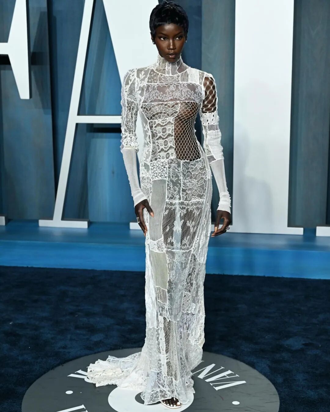 模特Anok在名利场的奥斯卡颁奖晚会上,身着比利时时装设计师 Olivier Theyskens 的超长紧身连衣裙,与今天如此工业化的时尚感觉形成了鲜明的对比。