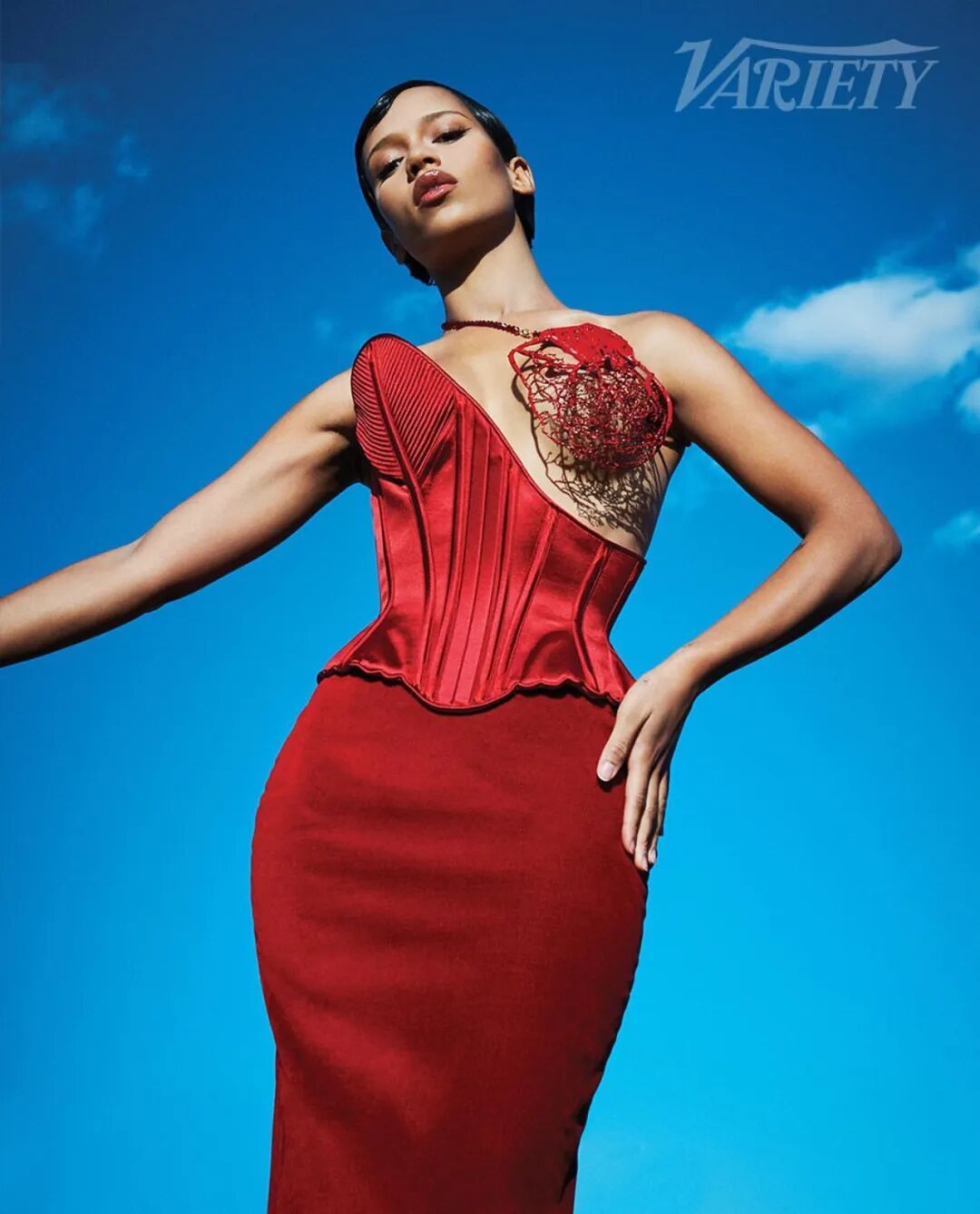 Taylor Russell因在《识骨寻踪》( Bones & All)中扮演的角色脱颖而出 ,无疑是今年穿着最佳的新星之一。她穿着Schiaparelli 黑色羊毛薄纱夹克,上有葡萄刺绣,搭配香槟双缎子疯狂收紧的紧身胸衣,从宽阔的帽檐下往外看的表情,沉着而神秘。