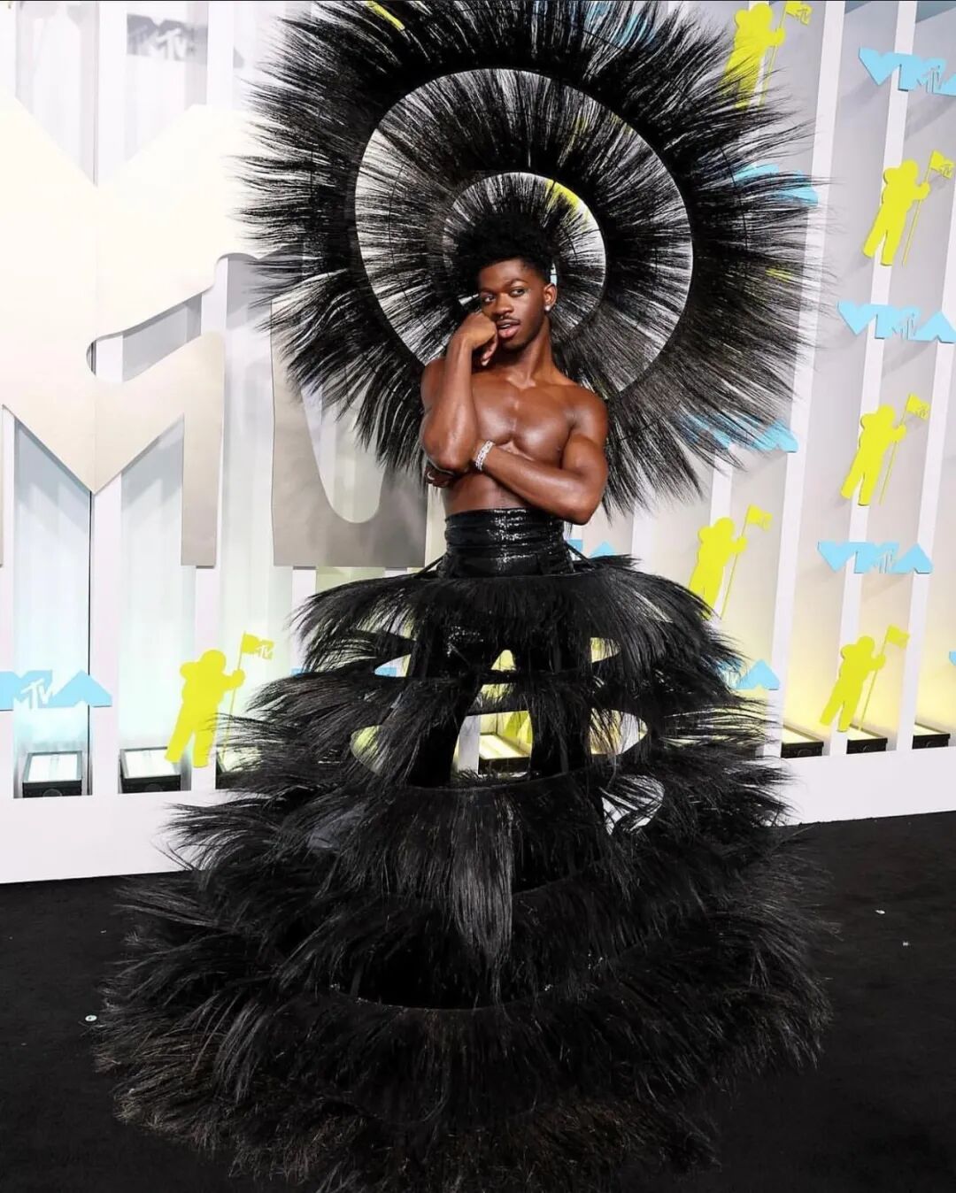 说唱歌手 Lil Nas X在MTV 音乐录影带大奖的时尚绽放,重新定义了男装,戏剧性的雕塑外观是英国设计师Harris Reed的作品,圆形羽毛头饰、饰有羽毛的环状裙子,下身搭配皮裤,一款全手工制作的Fluid Demi时装系列,使用来自Villa Bussandri的回收材料和100年历史的装饰面料。