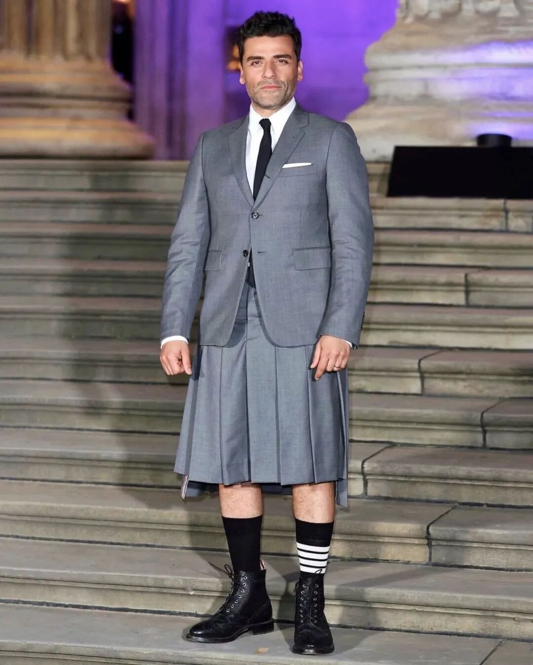 图:Oscar Issac 在宣传迪斯尼的 月亮骑士时穿 Thom Browne 西装外套和百褶裙,别致造型