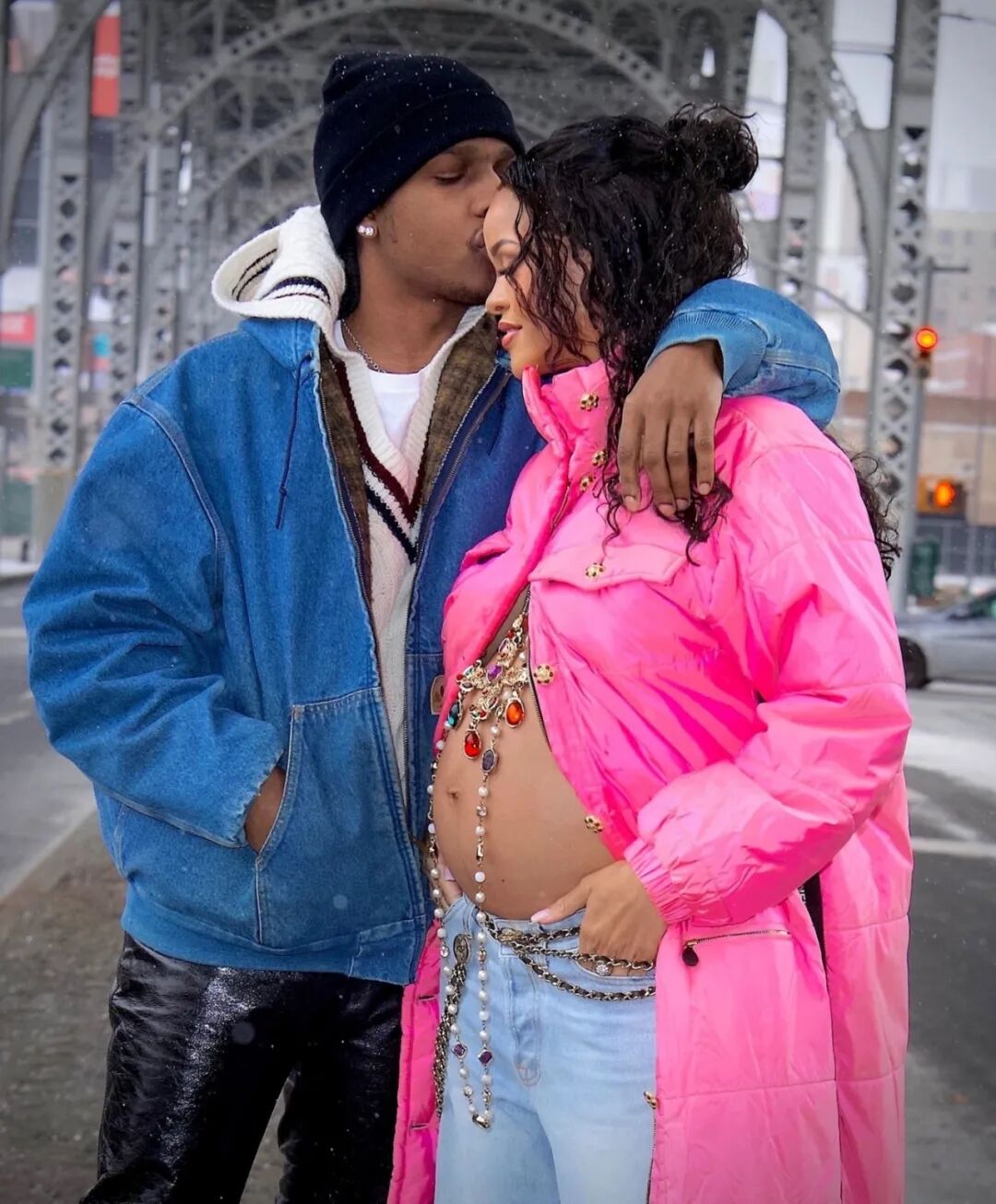 蕾哈娜 (Rihanna) 的孕期时尚堪称杰作!蕾哈娜穿着粉红色复古香奈儿大衣,带有珠宝金纽扣,来自1996年秋季系列超长撕裂牛仔裤,还有VOGUE封面以及乳胶孕妇装的GUCCI造型,都在向世界宣布“姐就是准辣妈女王!”