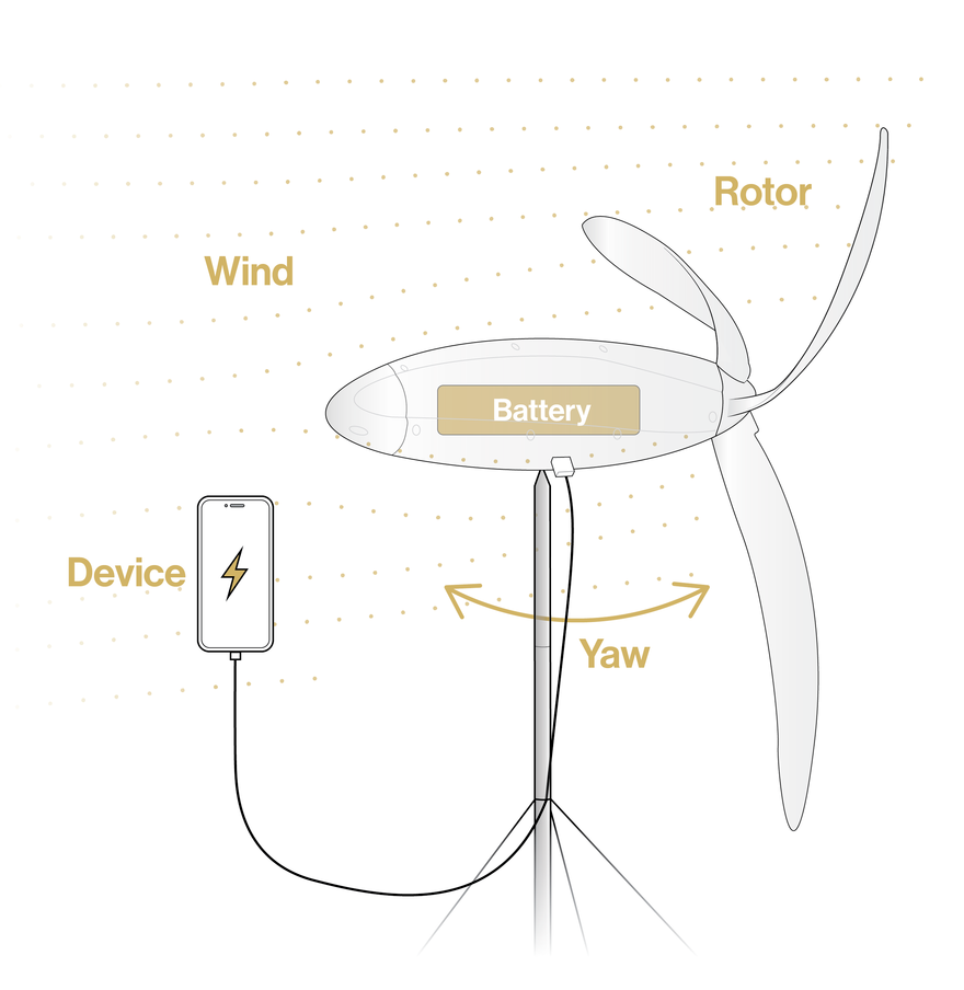 这是一种可以为内部电池自行充电的便携式风力涡轮机,它可以轻松地为手机、平板电脑、灯、相机等手持电子设备供电。它在各种天气条件下发电和储存电力的速度非常快,并且可以折叠成大约 1,000 毫升水瓶的大小。