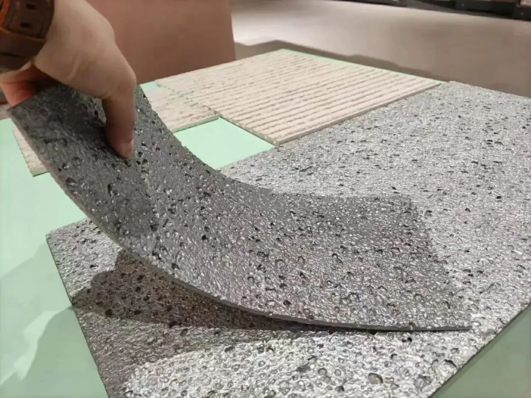 发泡铝合金效果的软瓷在外观效果上,能达到泡沫铝板80%的真实度。