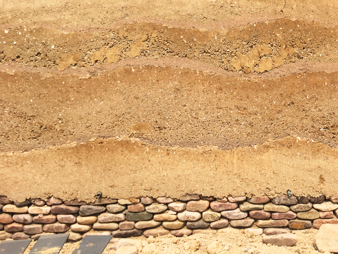 由砾石、黏土和砂子等混合物经过正确配比,经现场浇筑 ,预制夯土墙/板等工艺制成砖块或是整面夯土墙。