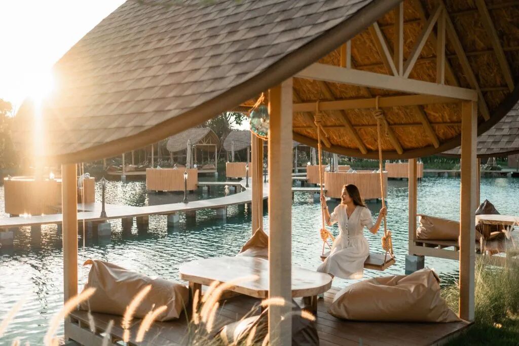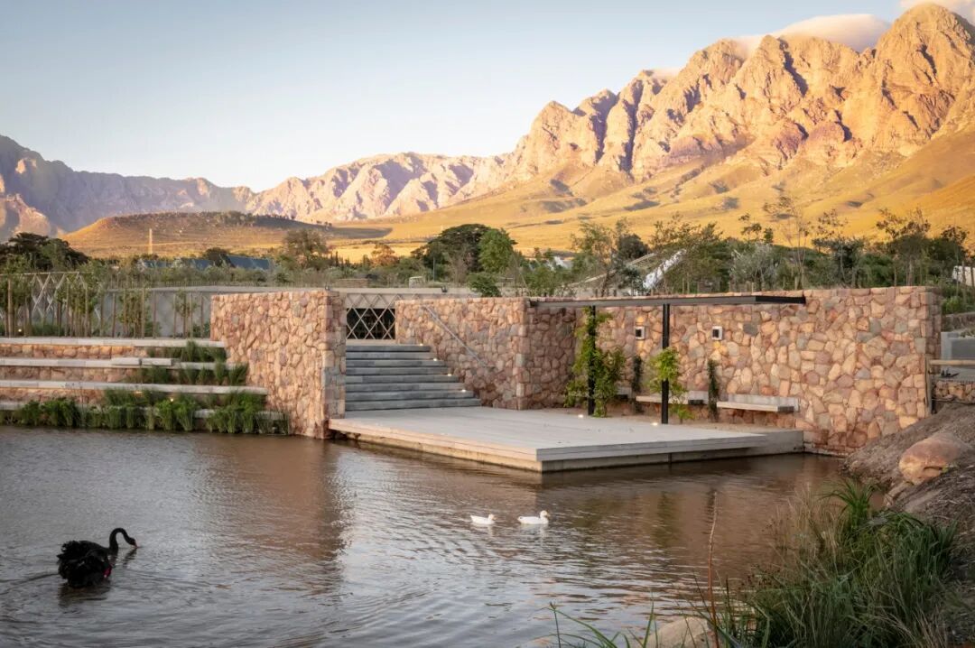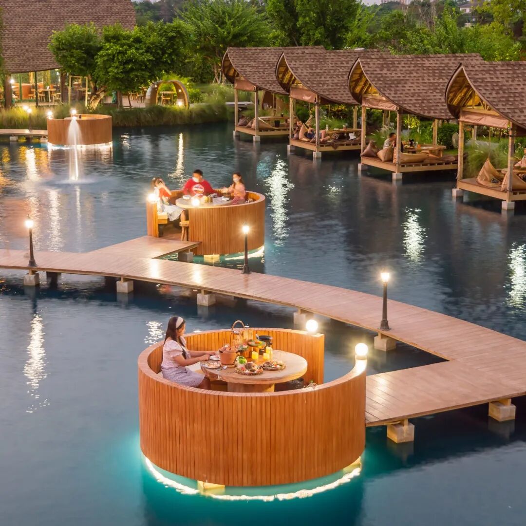 餐厅内没有设置空调,却能通过周围的水池和树荫使得在最热的季节也能感觉凉爽舒适。餐厅没有设置墙壁,可以一览无余地观赏周围的水池,邻近的河流以及远处的山脉。