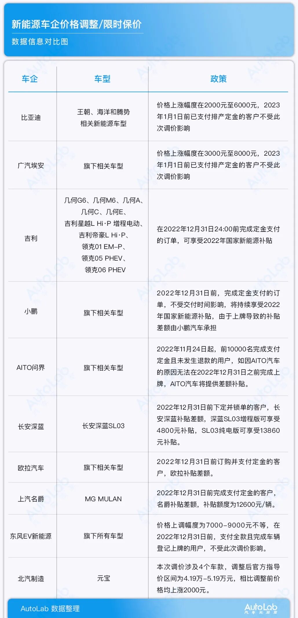 补贴取消、原材料涨价、“金九银十”热潮不再……种种因素叠加在一起,让新能源车企们叫苦不迭。随着龙头老大比亚迪在11月末官宣涨价,小鹏、埃安、问界等车企或者品牌纷纷官宣涨价或推出“限时保价”政策。