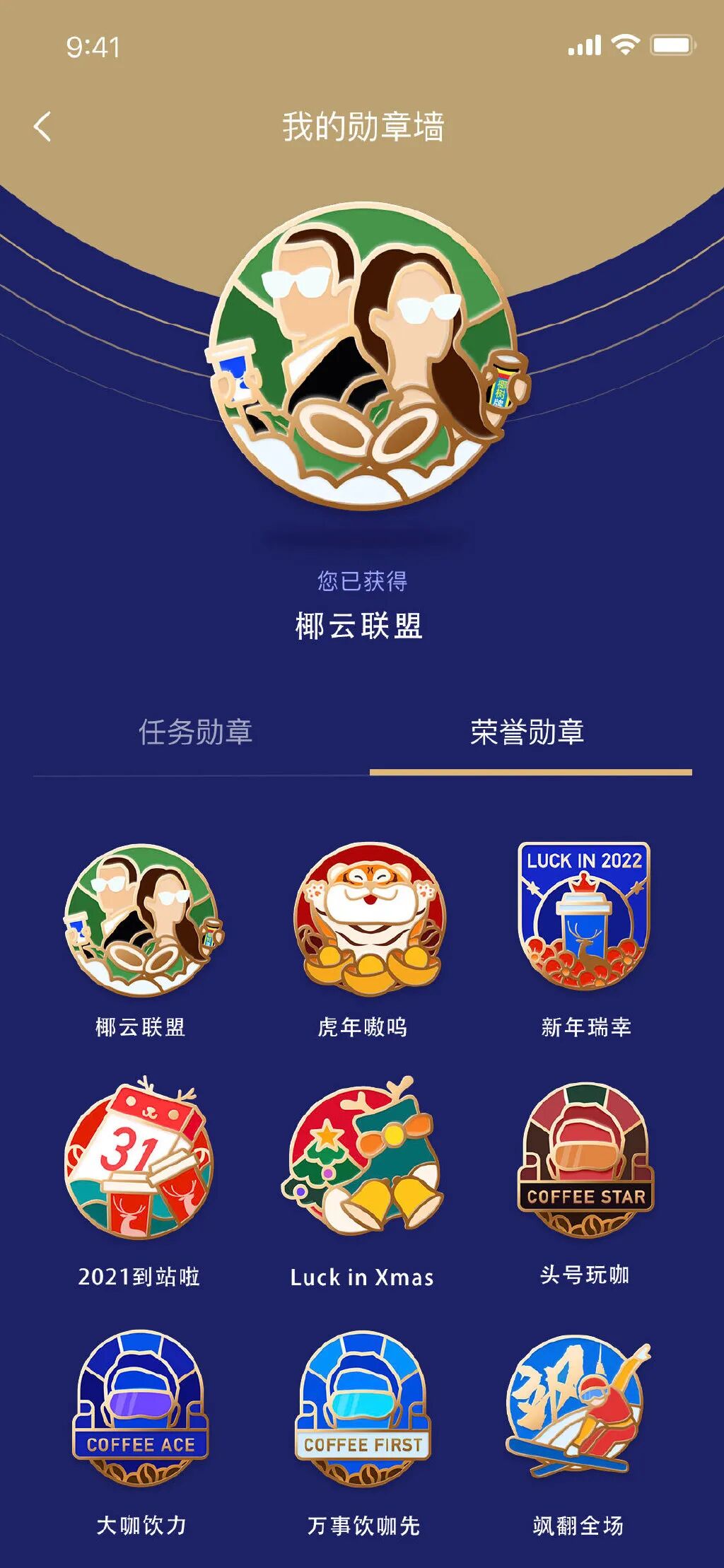 不得不说瑞幸还是很了解年轻人心里的,除了在包装上下功夫外,瑞幸还为此次营销推出了一些周边设计,比如椰云联盟勋章,消费椰云系列集勋章。