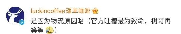 瑞幸也急忙做出了回应,表示因为物流原因,再等等!