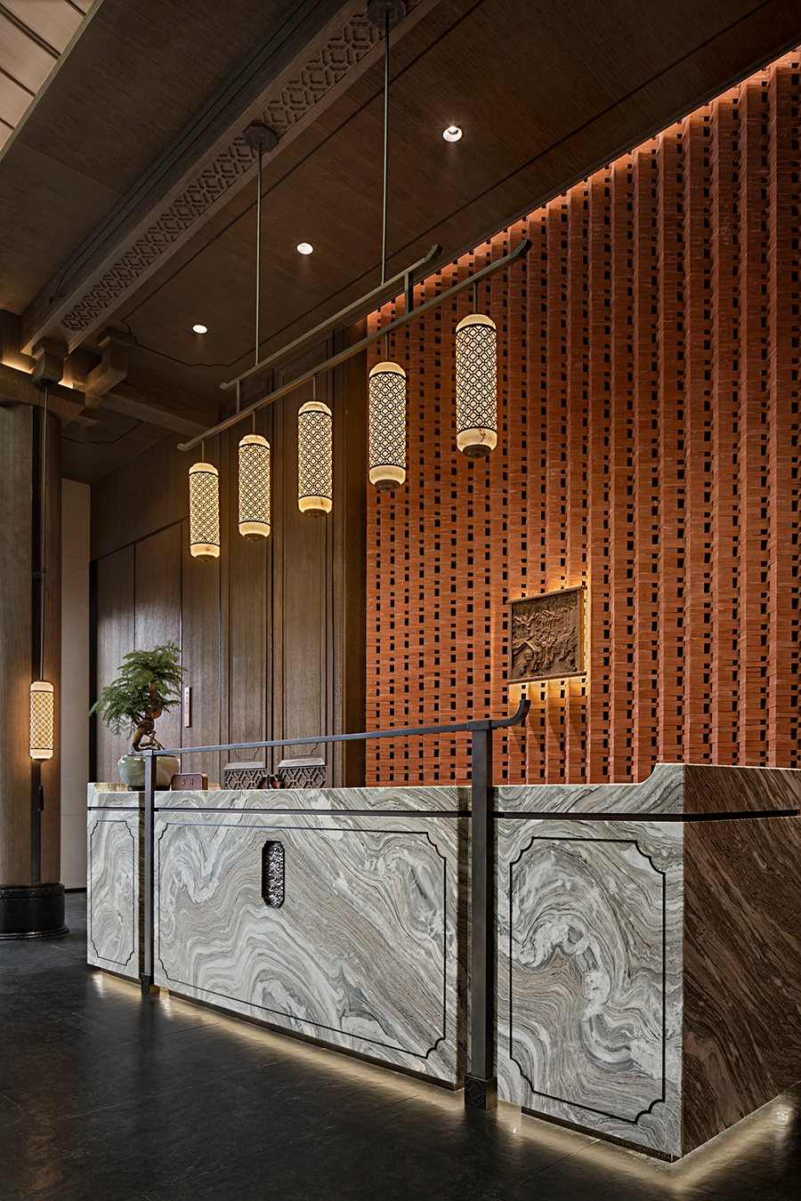 近观屋宅形制,红花窗围合点缀,于微厘之间再造天地,细部的窗格隐隐透着微光,浸润着古韵醇红,随着光影的折射,冥冥之中弥漫出崇高的美感。