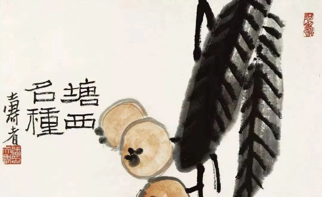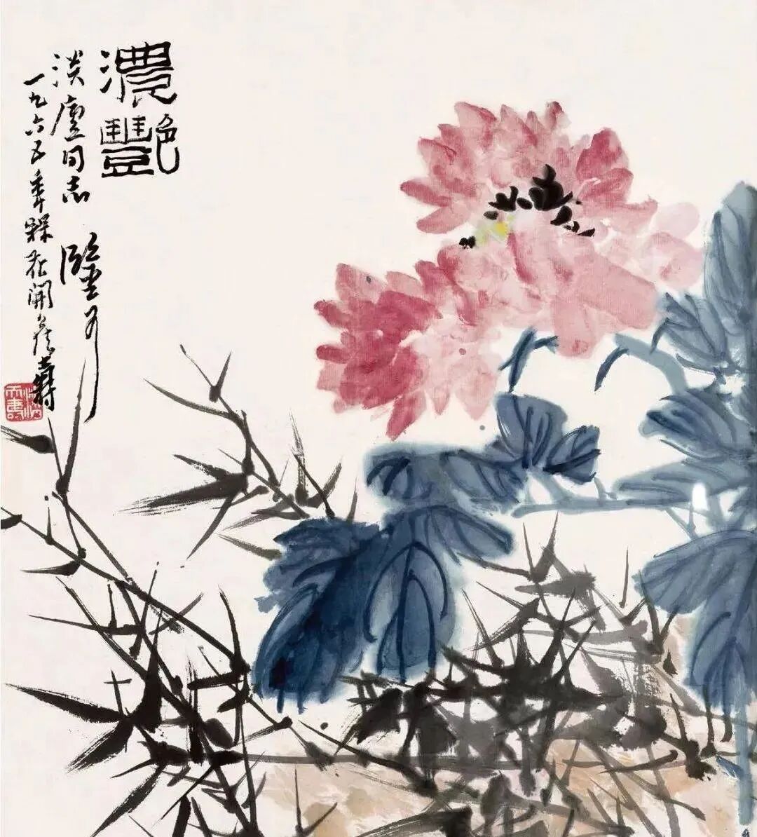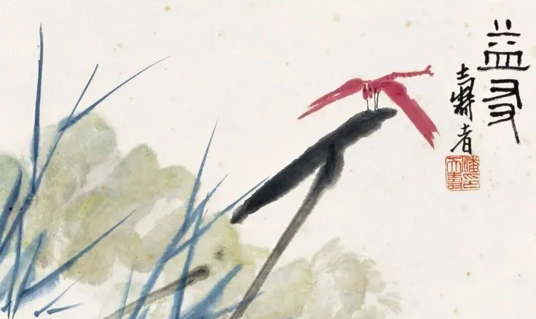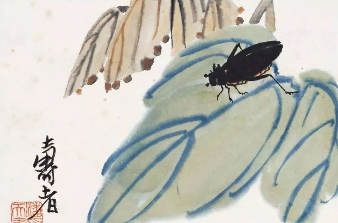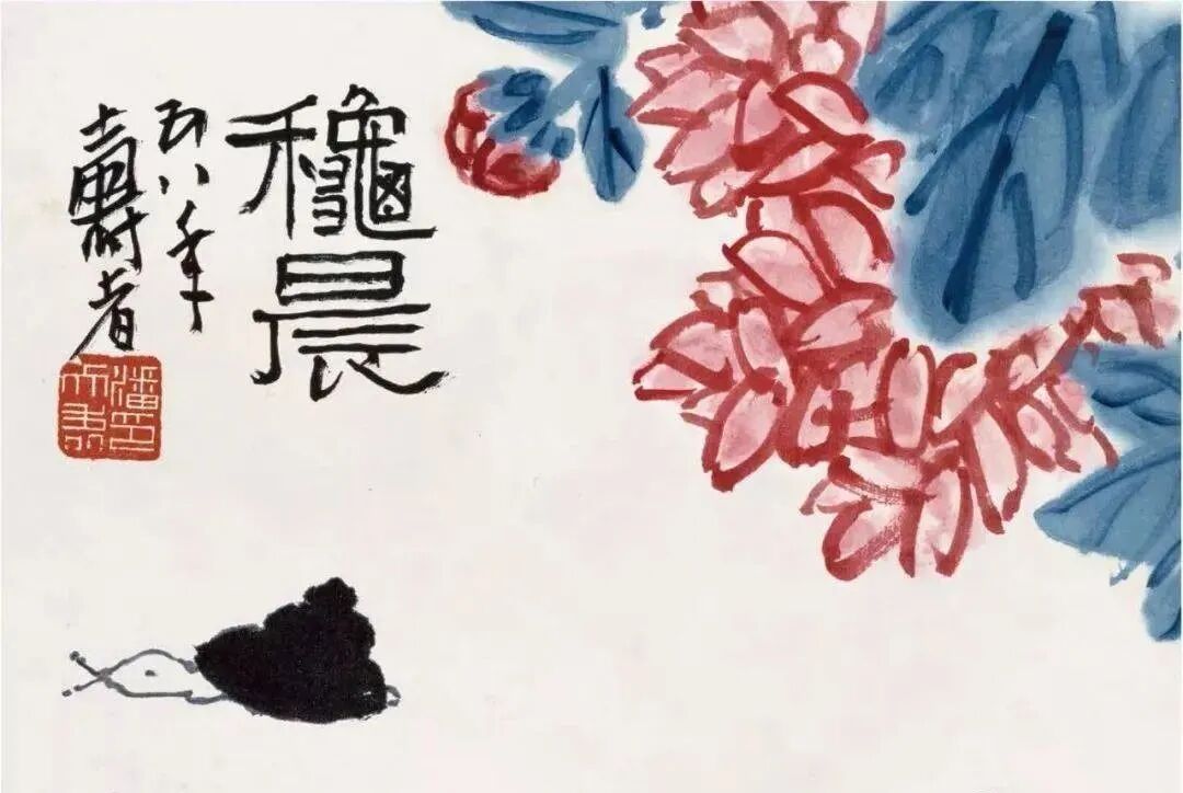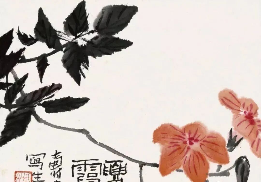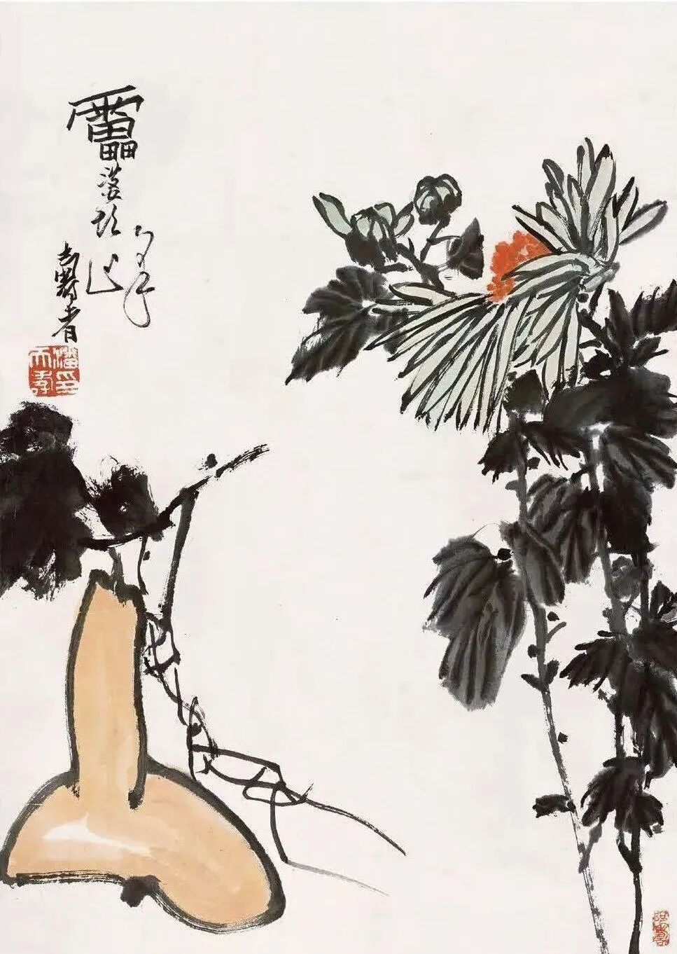故中国画家对于颜色的应用,根据上项的要求,只须配合得宜,不必呆守着对象实际的色彩。吴缶庐先生喜用西洋红画牡丹,齐白石先生喜用西洋红画菊花,往往都配以黑色的叶子。牡丹与菊花原多红色,但却与西洋红的红色不全相同,而花叶是绿色的,全与黑色无关。但因红色与墨色相配,是一种有力的对比,并且最有古厚的意趣,故叶子就配以墨色了,只要不损失菊花与牡丹的神形俱到就可。