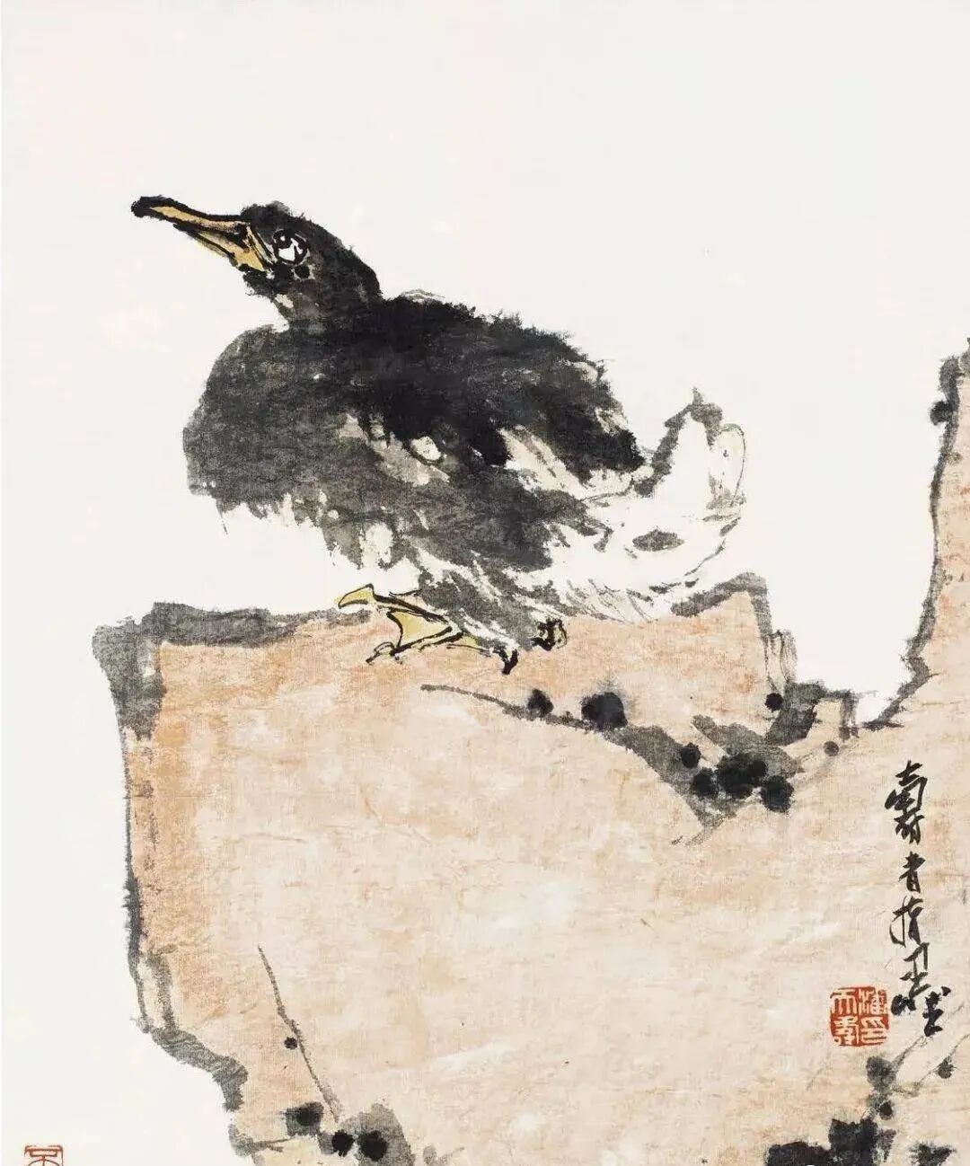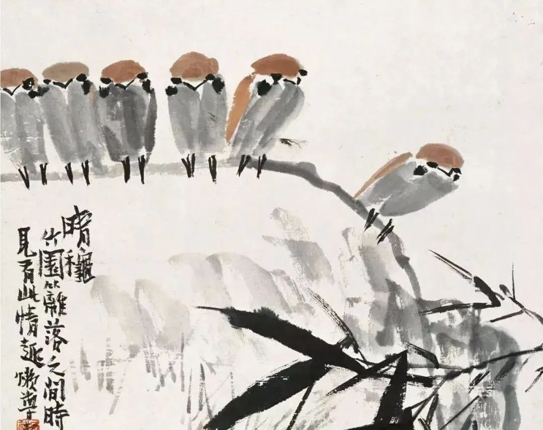 又例如画花鸟,枝干的欹斜交错、花叶的迎风摇曳、鸟的飞鸣跳动相呼相斗等等,无处不以线来表现它的动态。就以山水来说,树的高低欹斜的排列,水的纵横曲折的流走,山的来龙去脉的配置,以及山石皴法用笔的倾侧方向等等,也无处不表达线条上动的节奏。