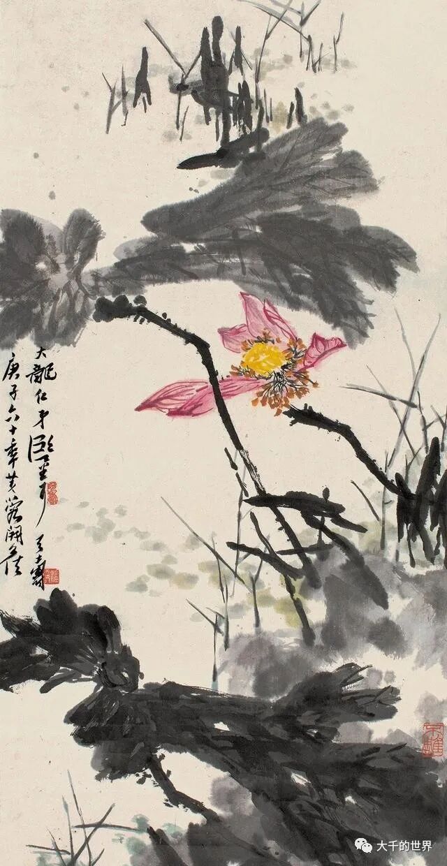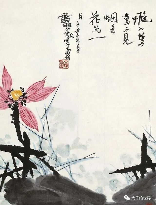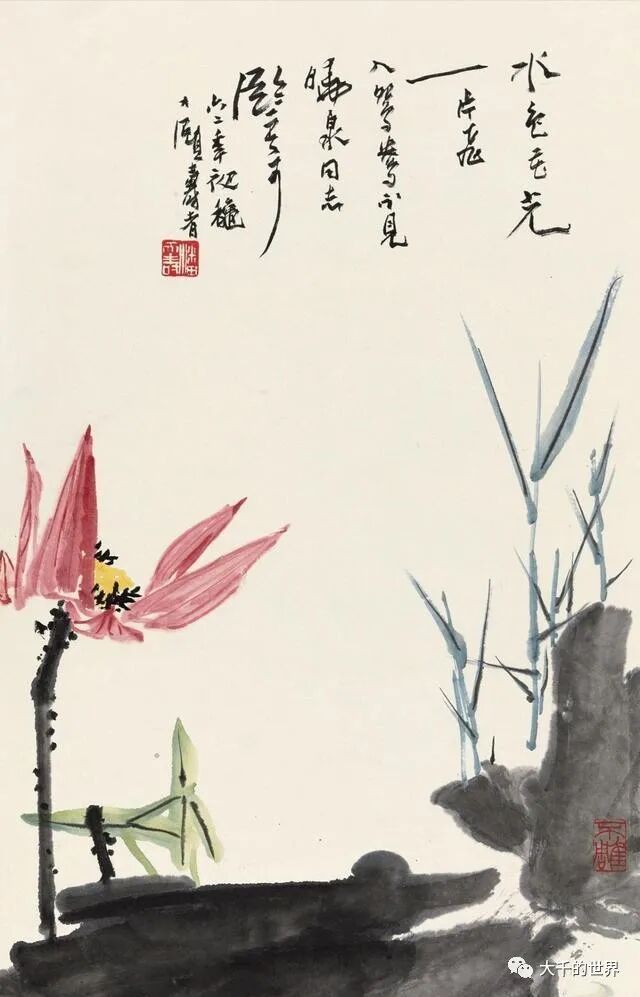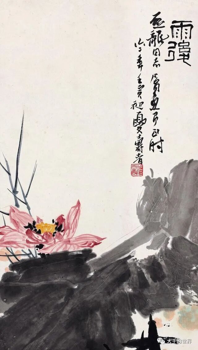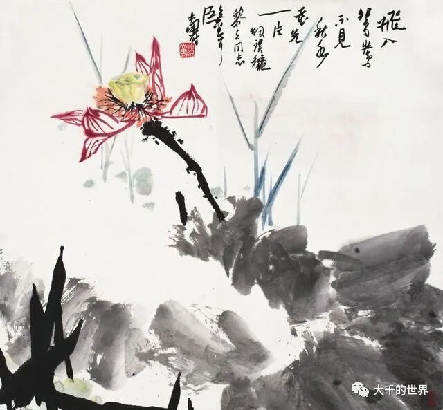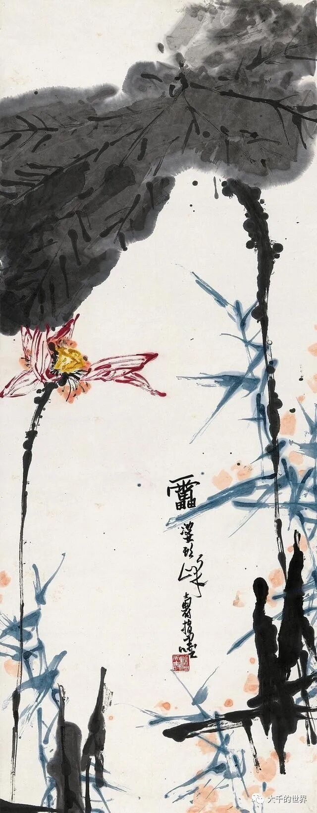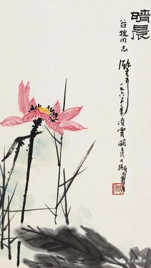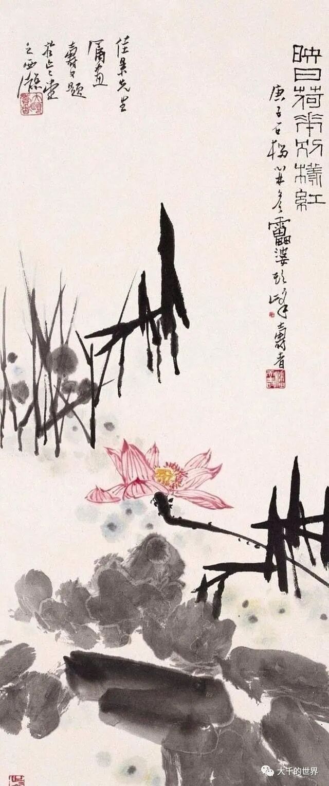 潘天寿画荷花与张大千、齐白石不相同,如果说前两位注重的是整体气势,那么潘天寿画荷花注重荷花的内涵。同样是写意荷花,潘天寿的荷花能给人一种文雅清润之感。
