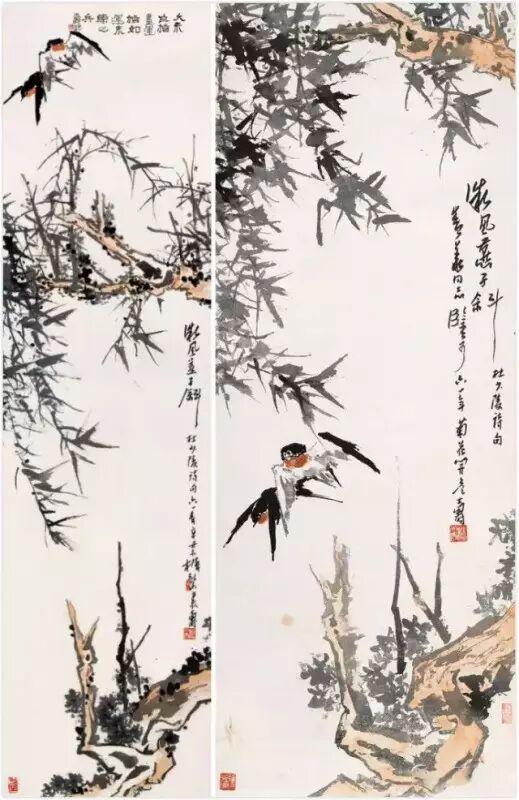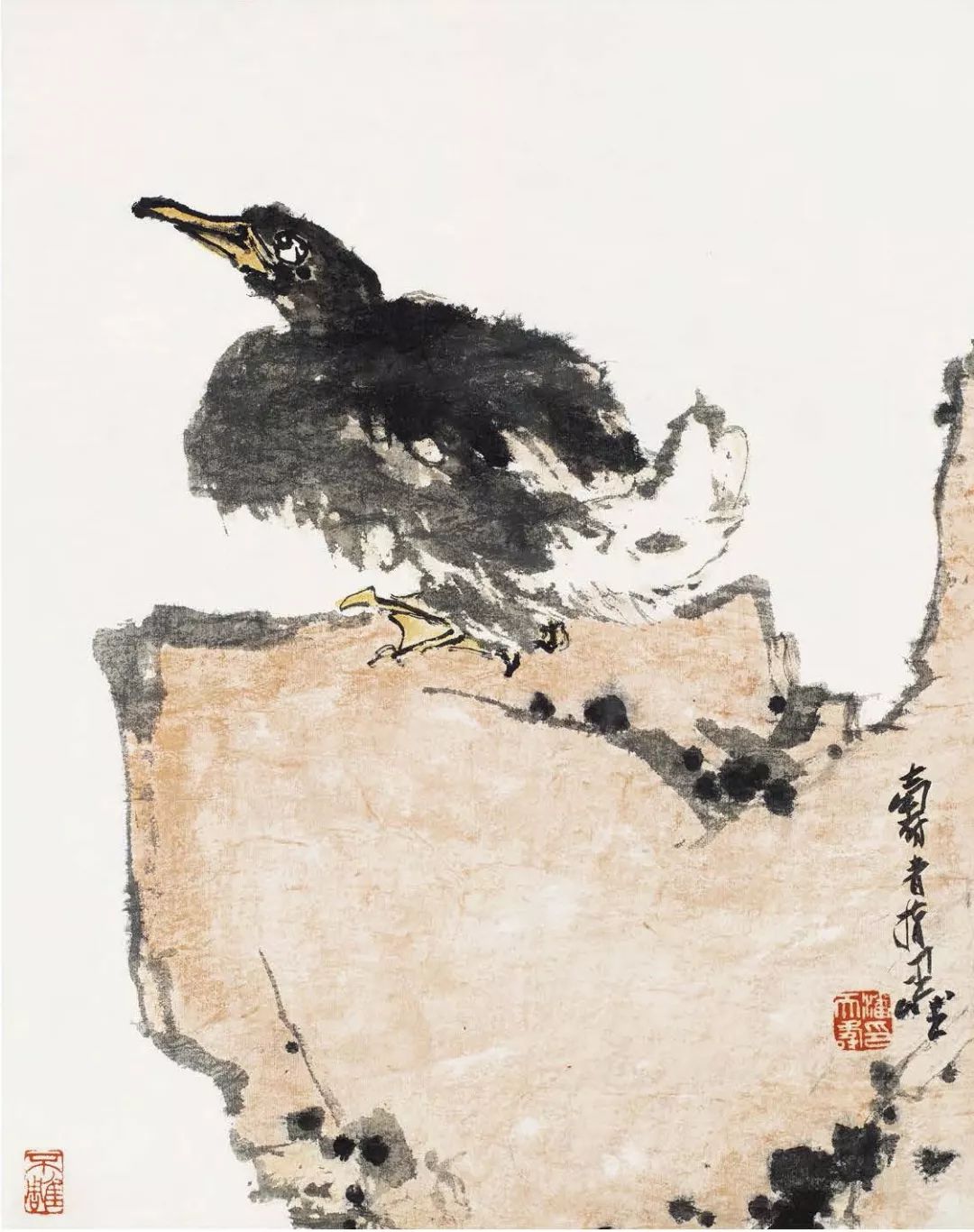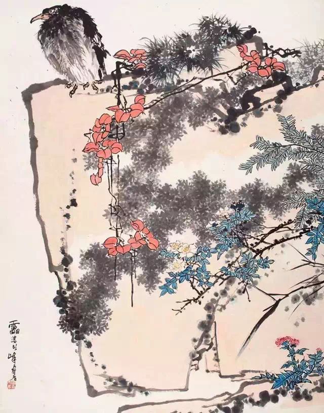 又例如画花鸟,枝干的欹斜交错、花叶的迎风摇曳、鸟的飞鸣跳动相呼相斗等等,无处不以线来表现它的动态。就以山水来说,树的高低欹斜的排列,水的纵横曲折的流走,山的来龙去脉的配置,以及山石皴法用笔的倾侧方向等等,也无处不表达线条上动的节奏。