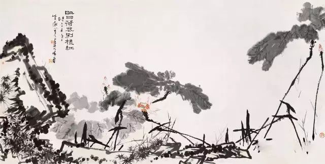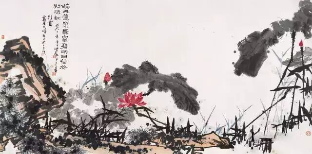 在唐宋以后,如倪云林、残道者、石涛和尚、吴昌硕等画家往往用长篇款,多处款,或正楷、或大草、或汉隶、或古篆,随笔成致。或长行直下,使画面上增长气机;或拦住画幅的边缘,使布局紧凑;或补充空虚,使画面平衡;或弥补散漫,增加交叉疏密的变化等等。故往往能在不甚妥当的布局上,一经题款,使布局发生无限巧妙的意味,成一幅精彩之作品。