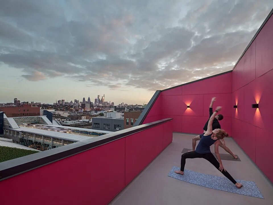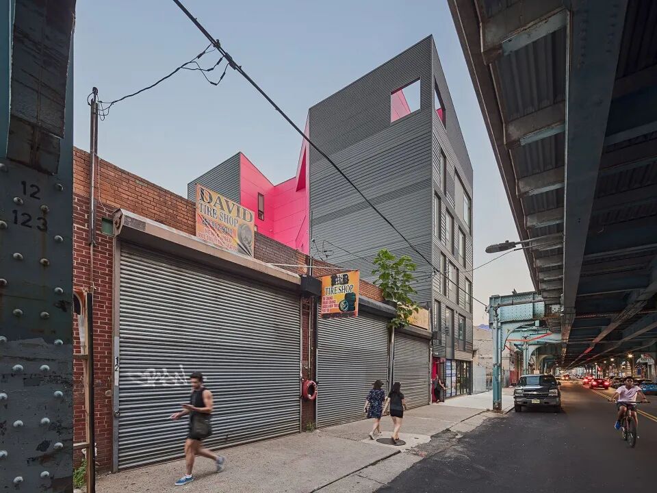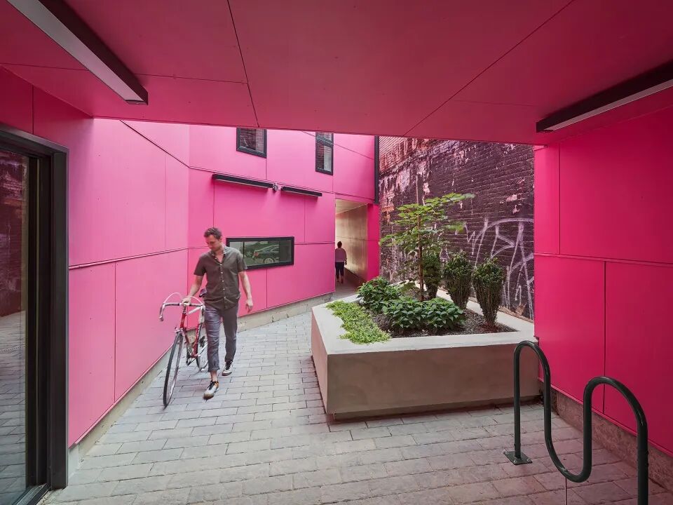 EI Rosé项目坐落在一块宽11米,长30米的基地上,由首层商业空间和11间公寓组成,连接Front大道和狭窄拥堵的Lee Street小街。受到基地周边粗粝环境的启发,设计利用深灰色波型金属板和纤维水泥壁板创造了一个纹理丰富的外壳。根据规范,建筑南立面不得开窗,一系列重叠的楼层在此形成了带有线条的墙面。雕刻出的室外入口走廊与前方街道相连,将人们引入中部的社交庭院和光井,创造出多孔的体量,亮粉色的社交空间在城市肌理中清晰可见。