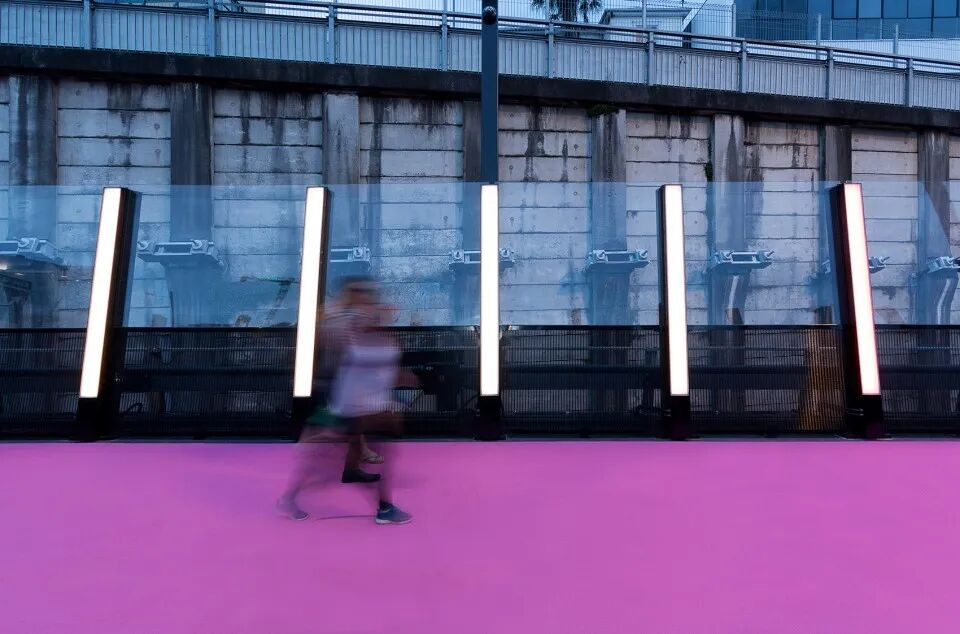 曾经被沥青所覆盖的道路如今铺上了一层靓丽而耀眼的粉色树脂颗粒,将这道划过空中的废弃车行道转变为极具现代色彩的步行桥。在道路的东侧,300个量身定制的LED灯箱顺桥身而立,形成了一道光脊。这些含有传感器的灯箱可通过程序变化色彩和亮度,灯光的舞动带来了多变的空间体验。