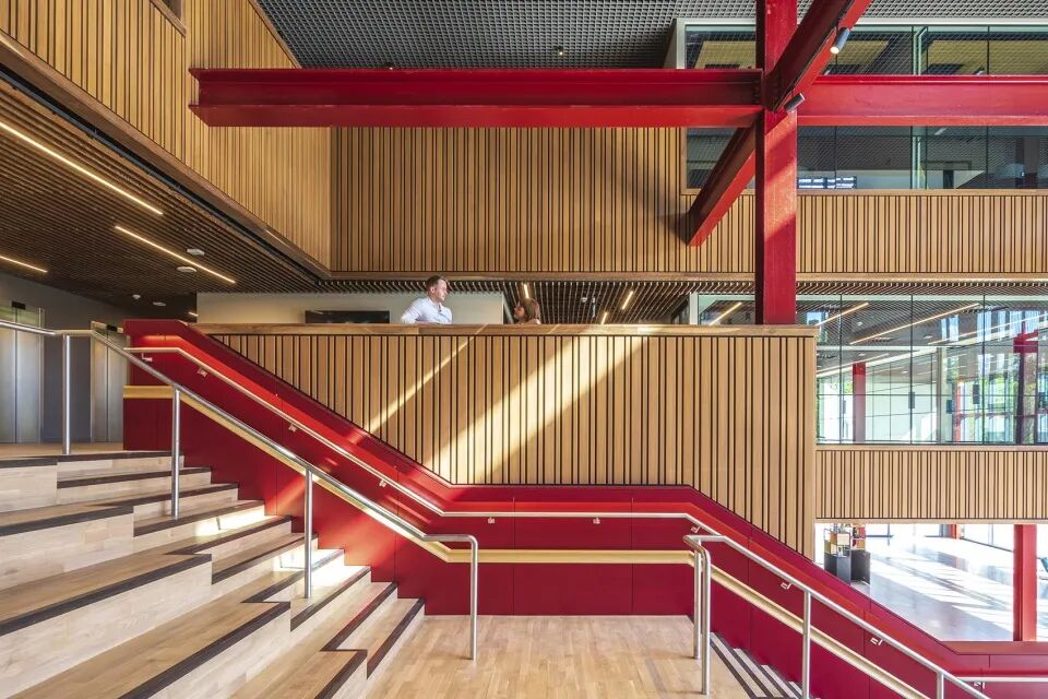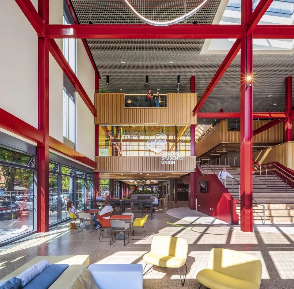 One Elmwood学生中心首次将大学内的各项服务内容整合在同一屋檐下,并将成为学生们的另一个“家”。11000平方米的灵活空间将容纳学生会和学生服务中心、曼德拉大厅,以及一处宽敞的多功能音乐和活动场所。设计以包容性为核心,旨在为学生们提供全方位的支持。红色的结构与木制肌理创造出宁静又不失活力的空间氛围。