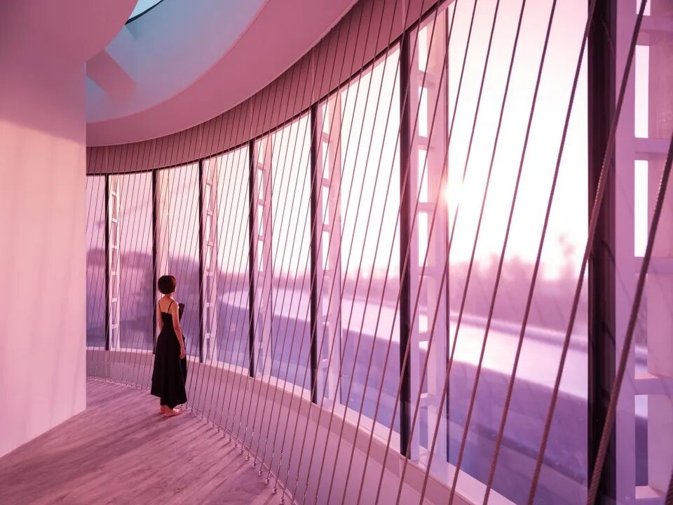 把独白美术馆的边界看成一条变化的线,起笔是椭圆形的小剧场。点是瑜伽室,枯笔是花墙,艺术长廊是联系这些的笔划,细的有些快的是走廊,用的是笔尖,然后变成侧峰形成慢的粗的线条就是放大的美术馆,再慢慢回到笔尖用笔一顿就是舞蹈教室。一开始的长廊和美术馆外侧封闭内侧对水院开放,而之后则是内侧封闭外侧对大景观开放,这就是运笔。设计者把最高的圆形瑜伽室外立面变成渐变的彩色玻璃。在浓墨中点彩,她就是熠熠生辉的玻璃堡垒。