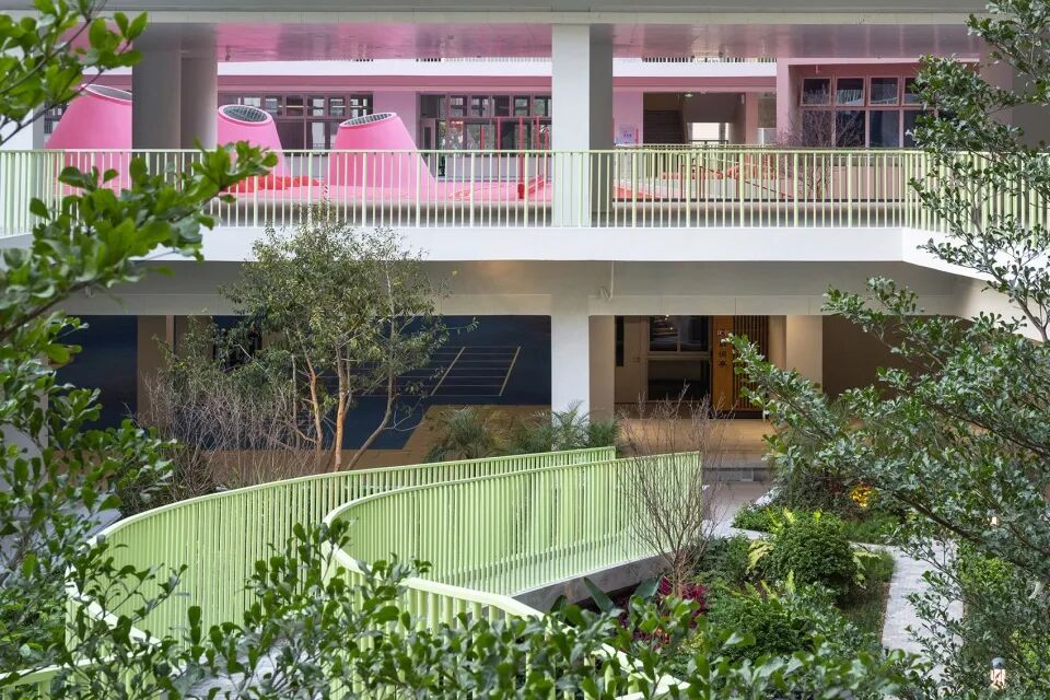 设计师为学校设计了多样的“主题游乐场”空间,而这些主题,不是通过商业化的主题性装饰,而是通过空间形态设计来获得,孩子们在不同主题的空间里自由地开展与之相关的活动;在新沙小学的校园里,有绿森林、浮桥、巷弄、三角山丘、圆顶城堡、入口山道、天台农场等。
