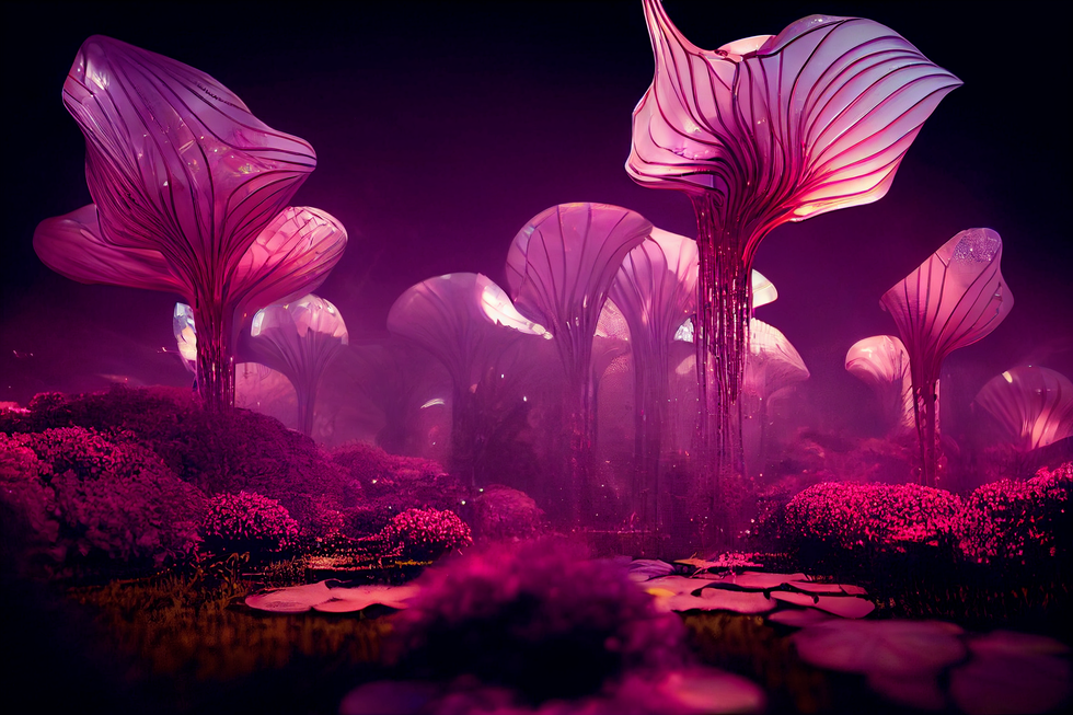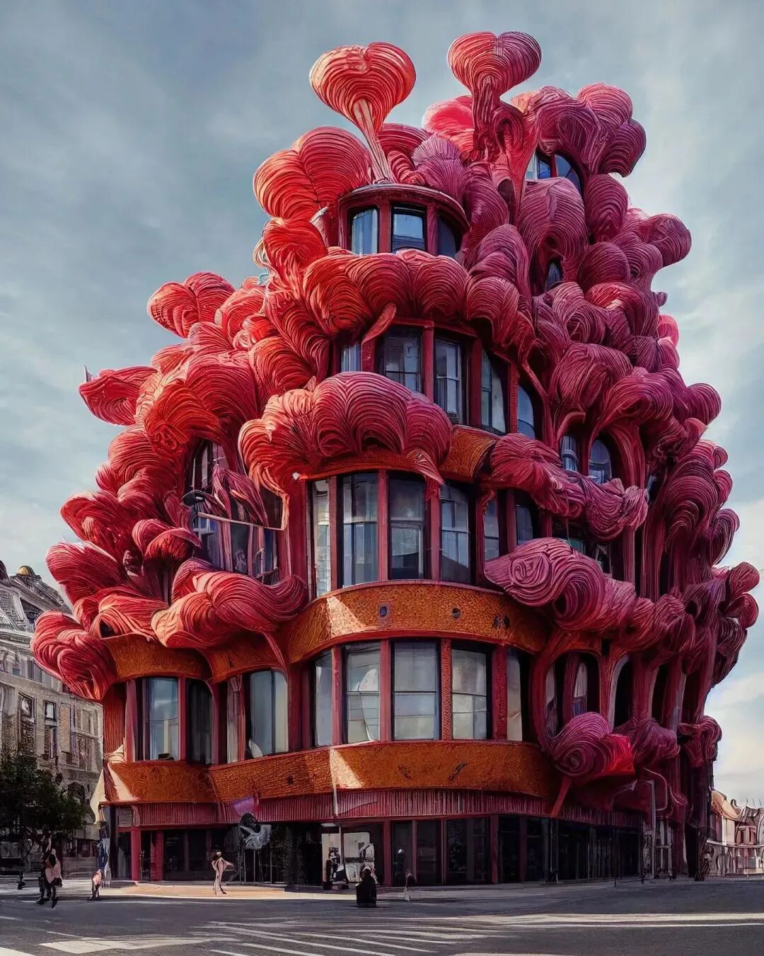 通过人工智能创作工具“Midjourney”进行创作的加州数字视觉艺术家HassanRagab,陆续尝试了一系列新艺术风格(Art Nouve)的虚拟建筑,鲜明的超现实主义,探索玻璃幕墙和“羽毛”等有机物的延伸关系,在建筑中混入植物、动物元素,打造出亲自然、与人类共生的未来城市想象。