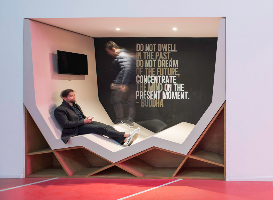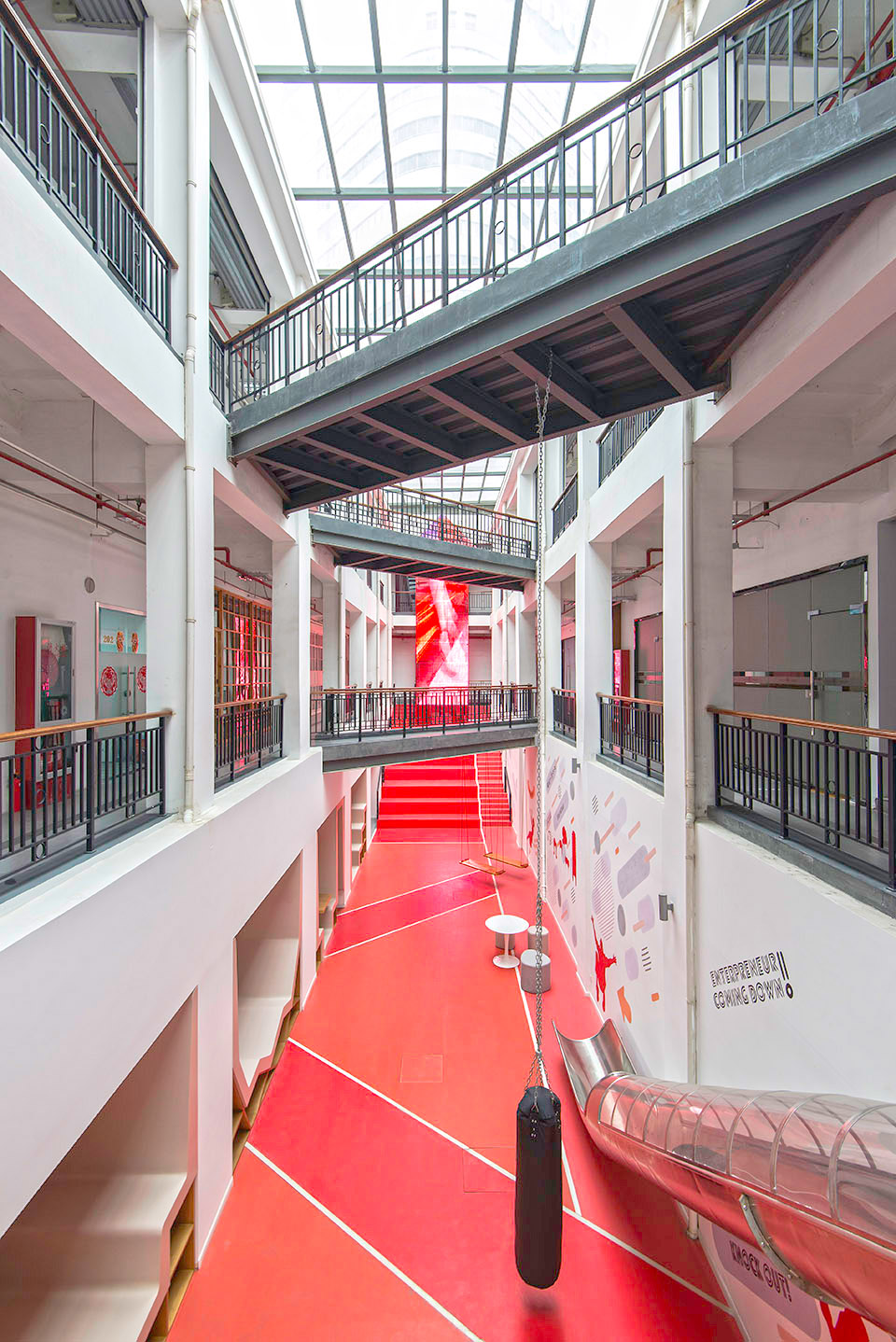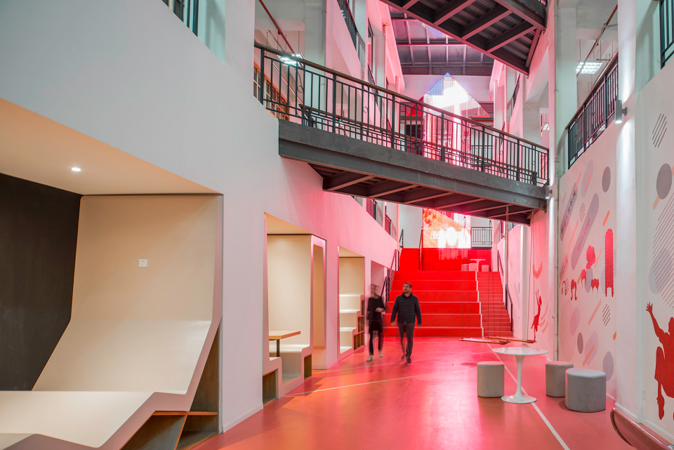为了达到“迎四方宾”的效果,以街上的迎宾红毯为参照,设计师在大厅里做出了一条亮眼的“红色跑道”,跑道尽头是一个“小剧场”,它既是通往二楼的楼梯,也是活动社交用的小憩处;其顶部是一个箭头状的LED显示屏,象征着克服与进步,耕耘与收获。