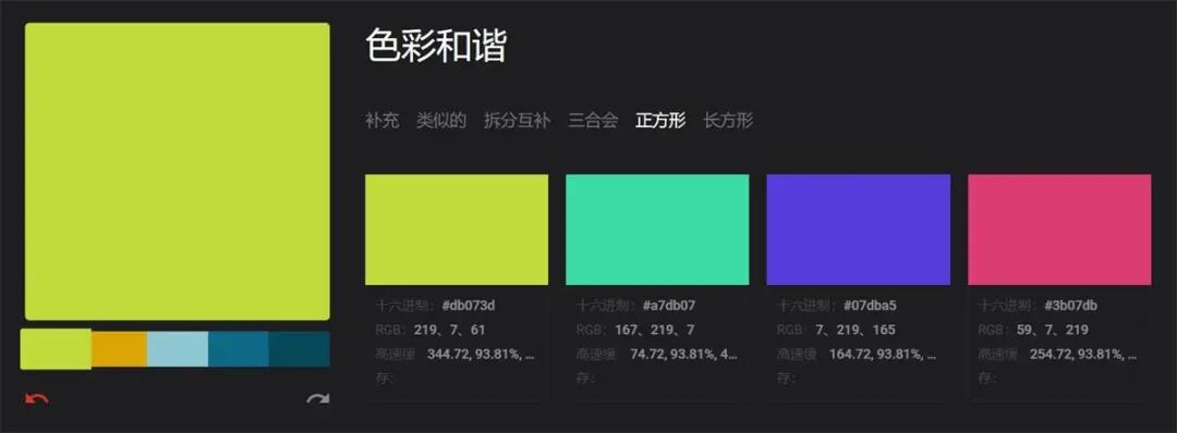 以此次流行色中我非常喜欢的一种颜色 Love Bird(爱情鸟)为例,首先我们使用 Color Designer 的调色板功能,为 Love Bird 配置一组和谐的色彩搭配。Color Designer 里面有提供互补色、类似色、分裂互补色、正方形等多种和谐配色方案,大家按自己的需求选取即可。