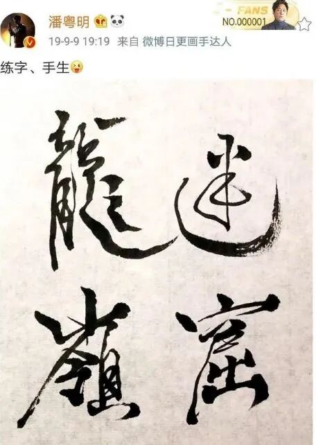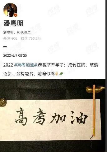 动态中,潘粤明配了一张自己的书法照片,写着“高考加油”。