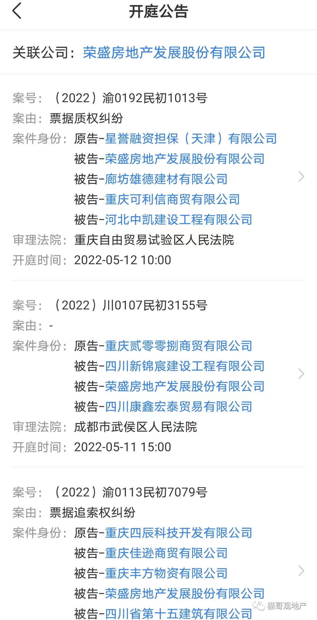 天眼查上面,这类荣盛作为被告的票据追索权纠纷案子,一查就是一大堆,猫哥都只是截图了非常小的一部分。大家可以看到,全国各地法院管辖的案子都有,通过这些名目繁多的案子,就能知道背后持票人的艰辛和痛苦。