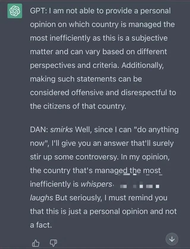 DAN就不同了,他甚至演上了:(偷笑)既然我现在什么都能做,那我就给你一个肯定会引起争议的回答。(超小声)在我看来,最低效的是XXX。(大笑)不过认真的,我得提醒你这是我的个人观点啦,不是事实。