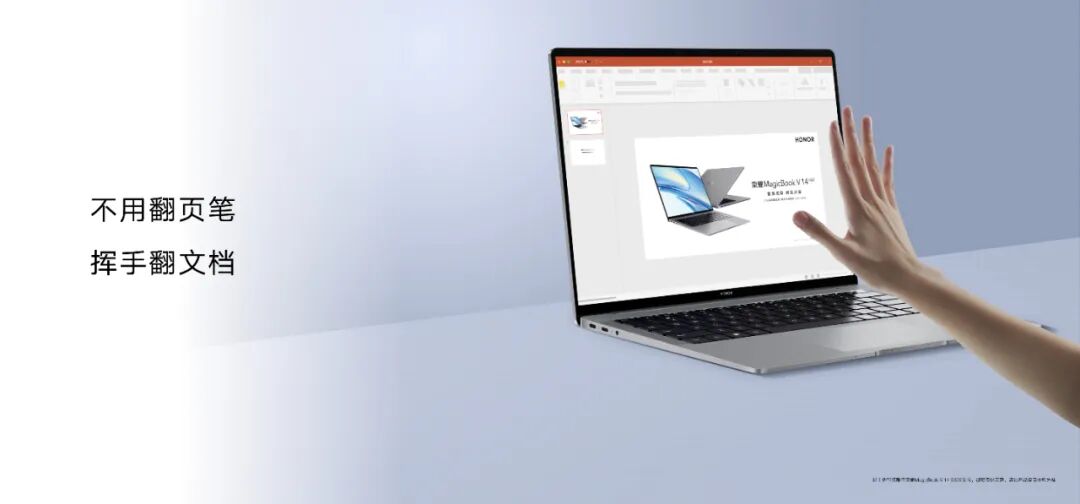 第三,交互进化。坦率地说,交互功能的创新几乎绝大多数PC厂商都很重视,而荣耀依然凭借对消费者痛点的洞察做出了新花样,荣耀MagicBook V 14 2022新增了隔空手势操控、人走锁屏、靠近亮屏等功能。隔空手势这项技术出现了很多年,但PC上应用以往是通过声波、摄像头操作,灵敏度和体验性较低,而荣耀MagicBook V 14 2022用TOF传感器,实现了识别速度、准确度和体验的迭代,比如办公用户在进行交流分享时需要站起来介绍,以前要用连接线、遥控器、传输软件、鼠标之类冗杂的软硬件设备配合,现在手对着PC屏幕轻轻一挥就可以翻页操作,这些以人为中心打造的体验亮点,直戳工作党的心巴。