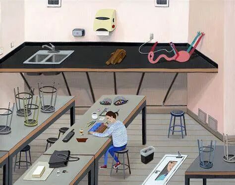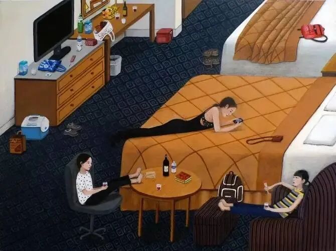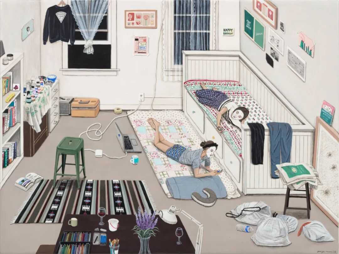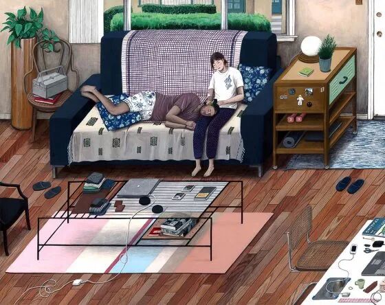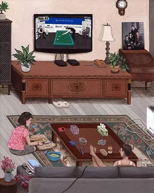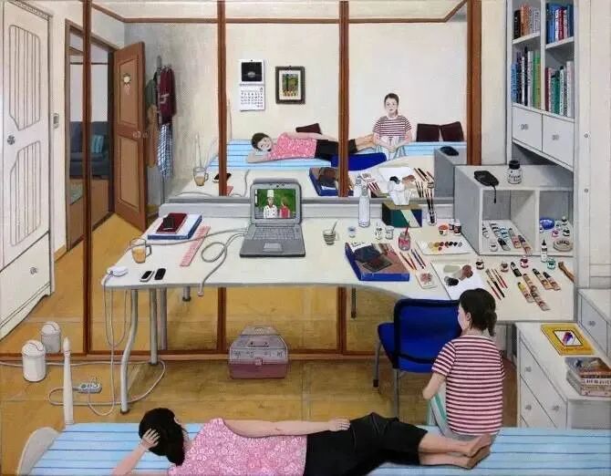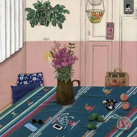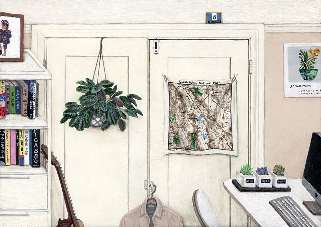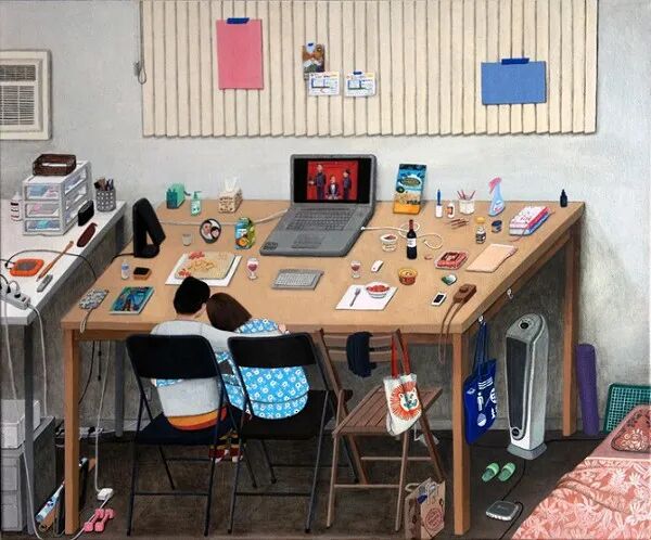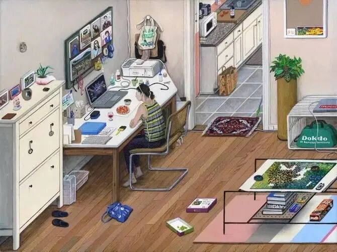 从Paige Jiyoung Moon 的作品中可以看到许多她=生活的场景,场景中的许多细节被刻画出来。餐桌上的食物、书桌上的书本、电脑等,非常细致,细细品味这种细节很有趣。画作中艺术风格有着韩国人刻板的执着,力争将每一个细节都完美复刻在画板之上。PaigeJiyoung Moon的插画作品,可以让我们一秒钟看懂立体图图像,也可以让我们在两秒钟内读懂生活。